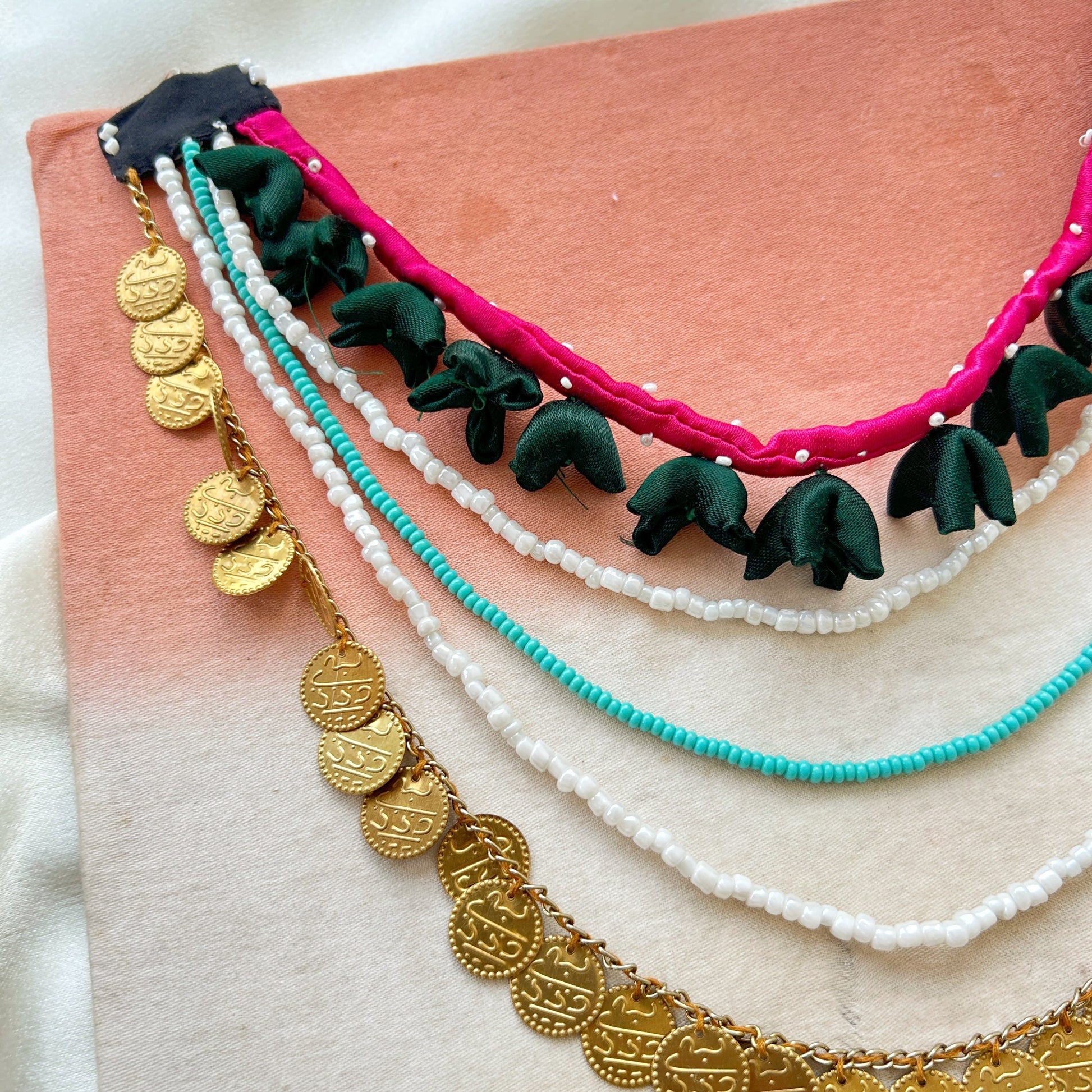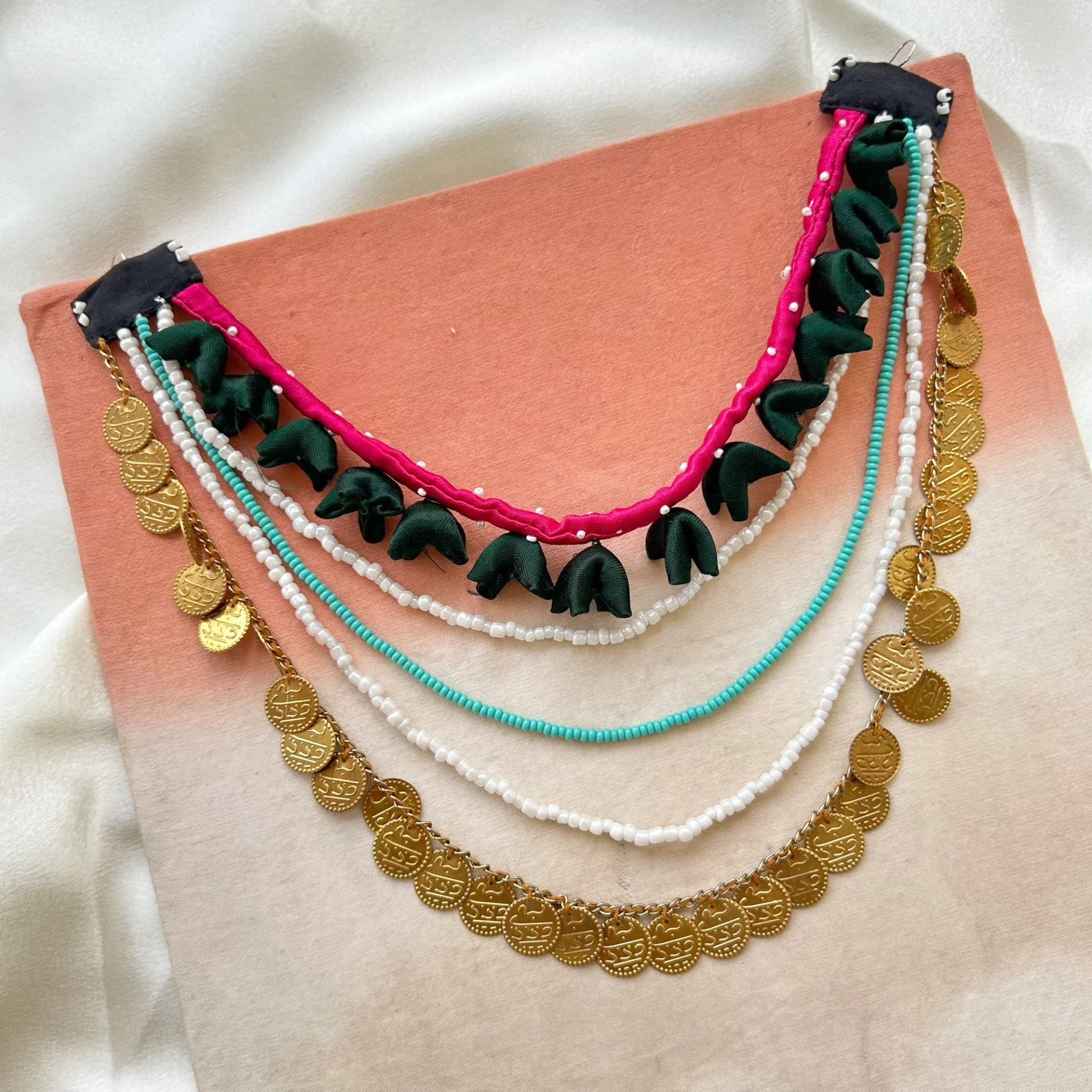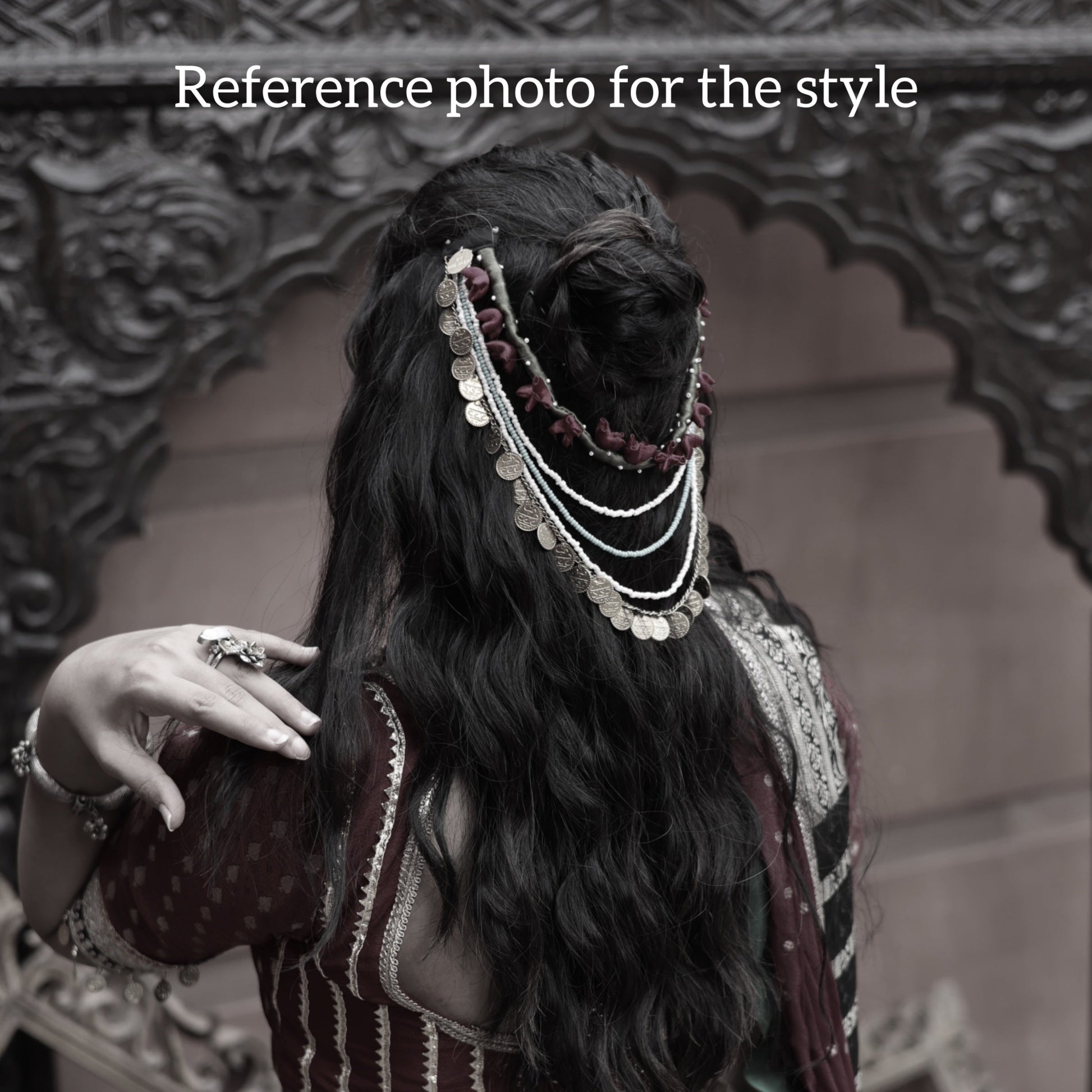 Elevate your hairstyle with this exquisite double clip-in layered hair accessory, crafted from textile, beads, and brass coins. Designed to be tied below your bun or half bun, it features hooks for easy hanging and clip-in comb pins for added security. A perfect blend of intricate design and functionality, this accessory brings a unique, stylish flair to any look.