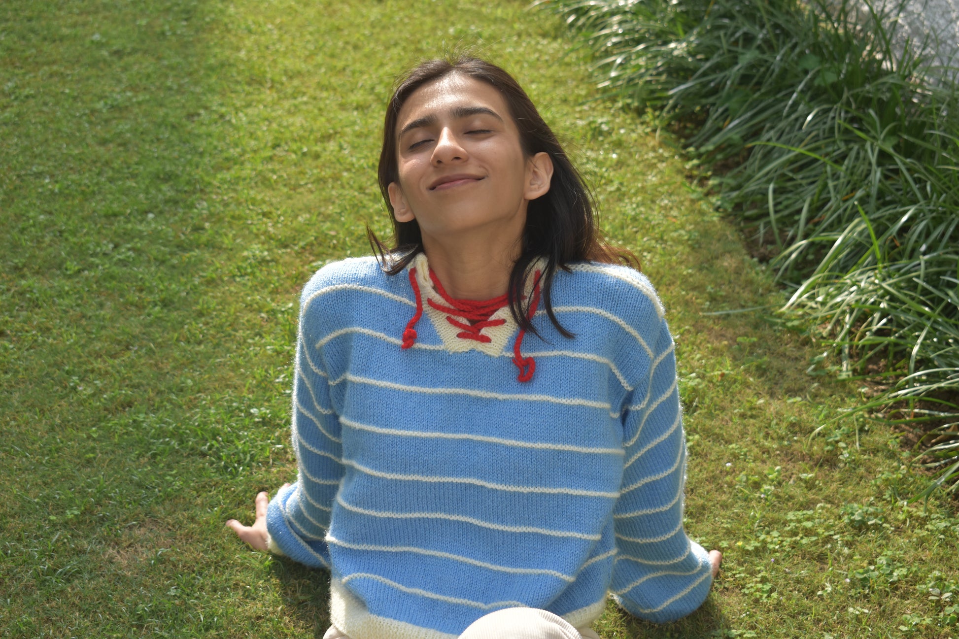 Wrap yourself in warmth and style with this handcrafted crochet sweater. Knitted with love and care, this timeless piece features a classic blue hue with a subtle white stripe and a cozy round neck. The full-length sleeves and relaxed fit make it perfect for chilly days.