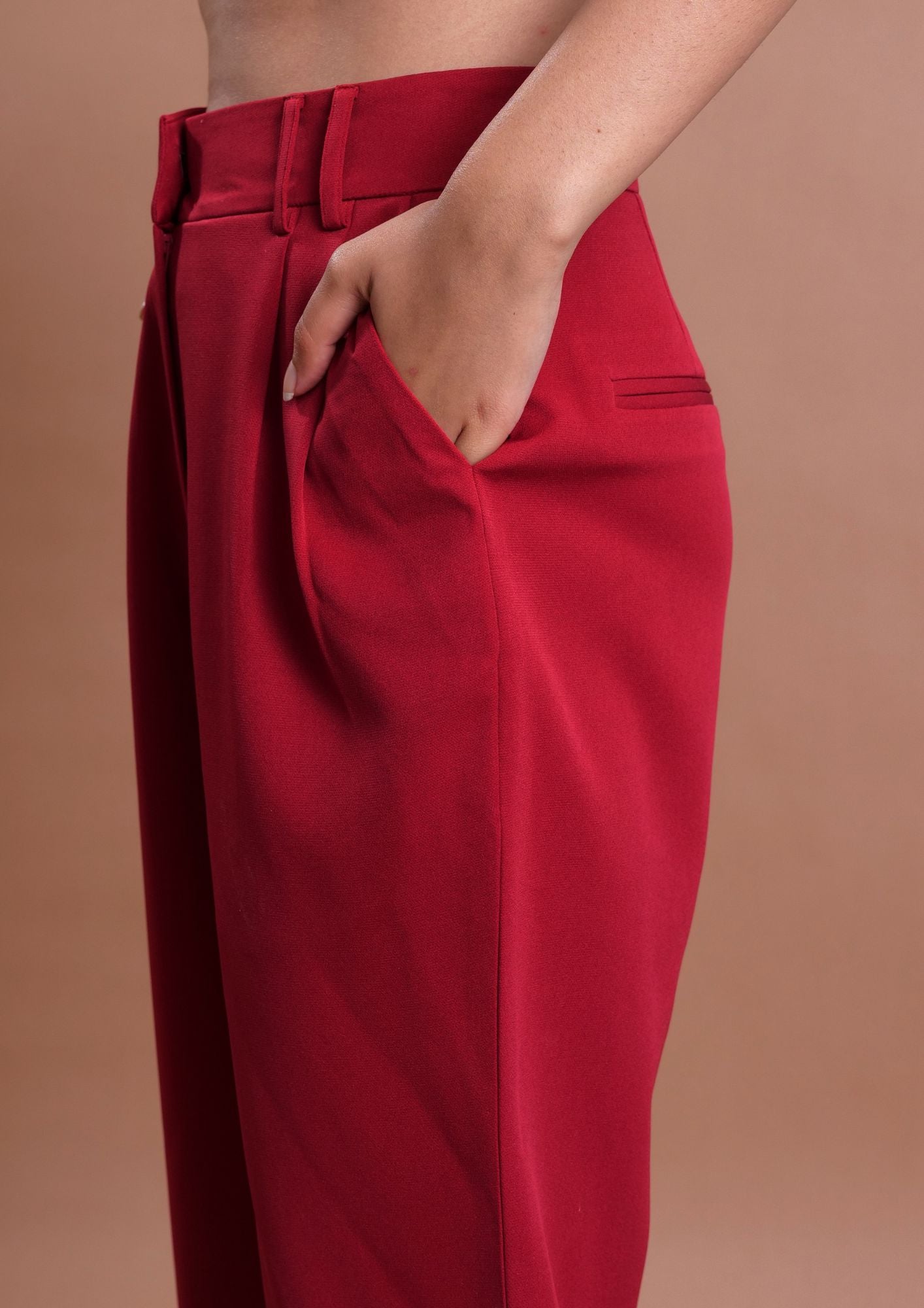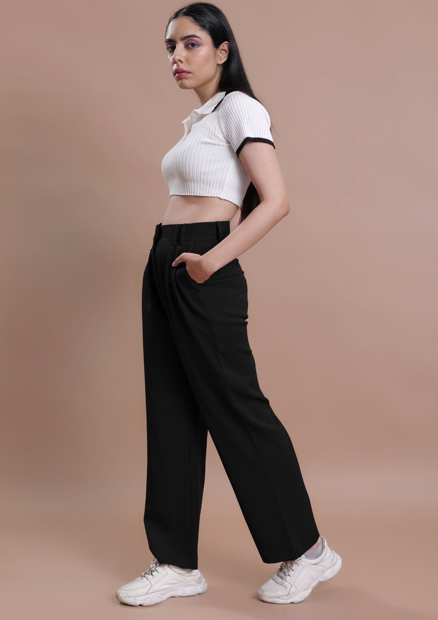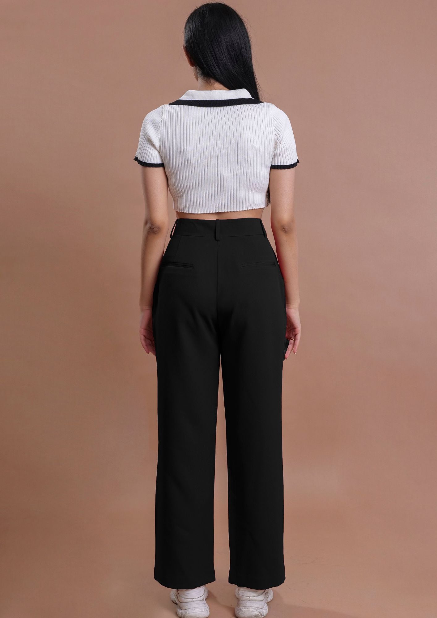 High waist straight trousers with relaxed fit. Featuring front opening, cross pockets and false welt pocket on the back.
