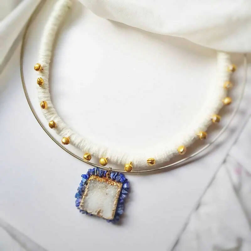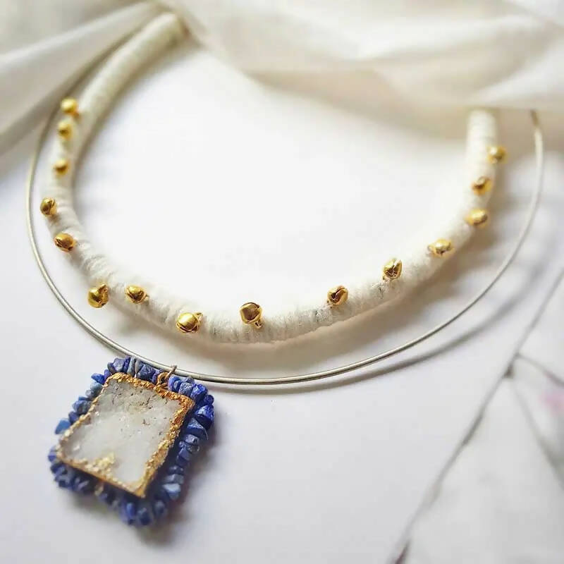A traditional collar bone necklace, Hansli. Adorned with a dash of modern elements like colourful edging stone and intricate details of ghunghroos to enhance the elegance of ancient history.