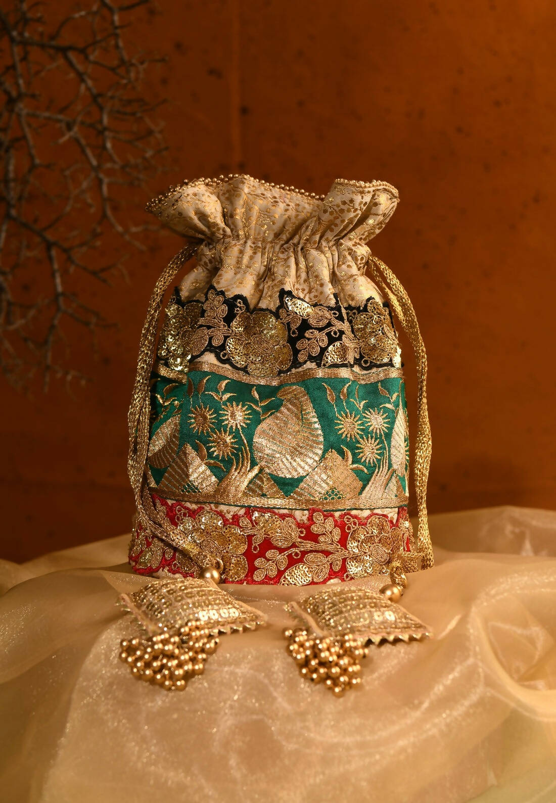 Elevate your festive or wedding attire with our exquisite Potli ethnic bag. Handcrafted, this bag is the perfect accessory to complement your traditional look.The thoughtful assemblage of silk, gold, brocade, Banarasi fabrics, finely stitched together to create this elegant piece. It has satin lining, two inner pockets and proper cushioning.