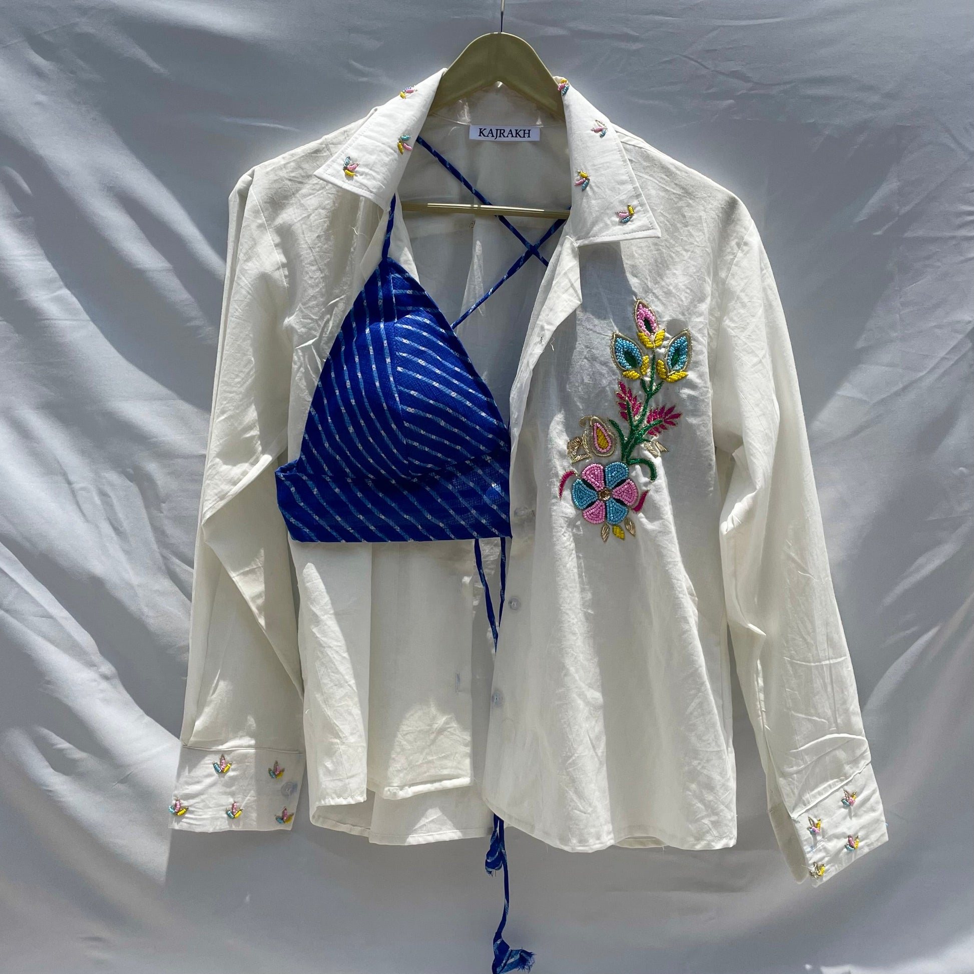 Embroidered Shirt with Blue Lehariya Bralette Combo