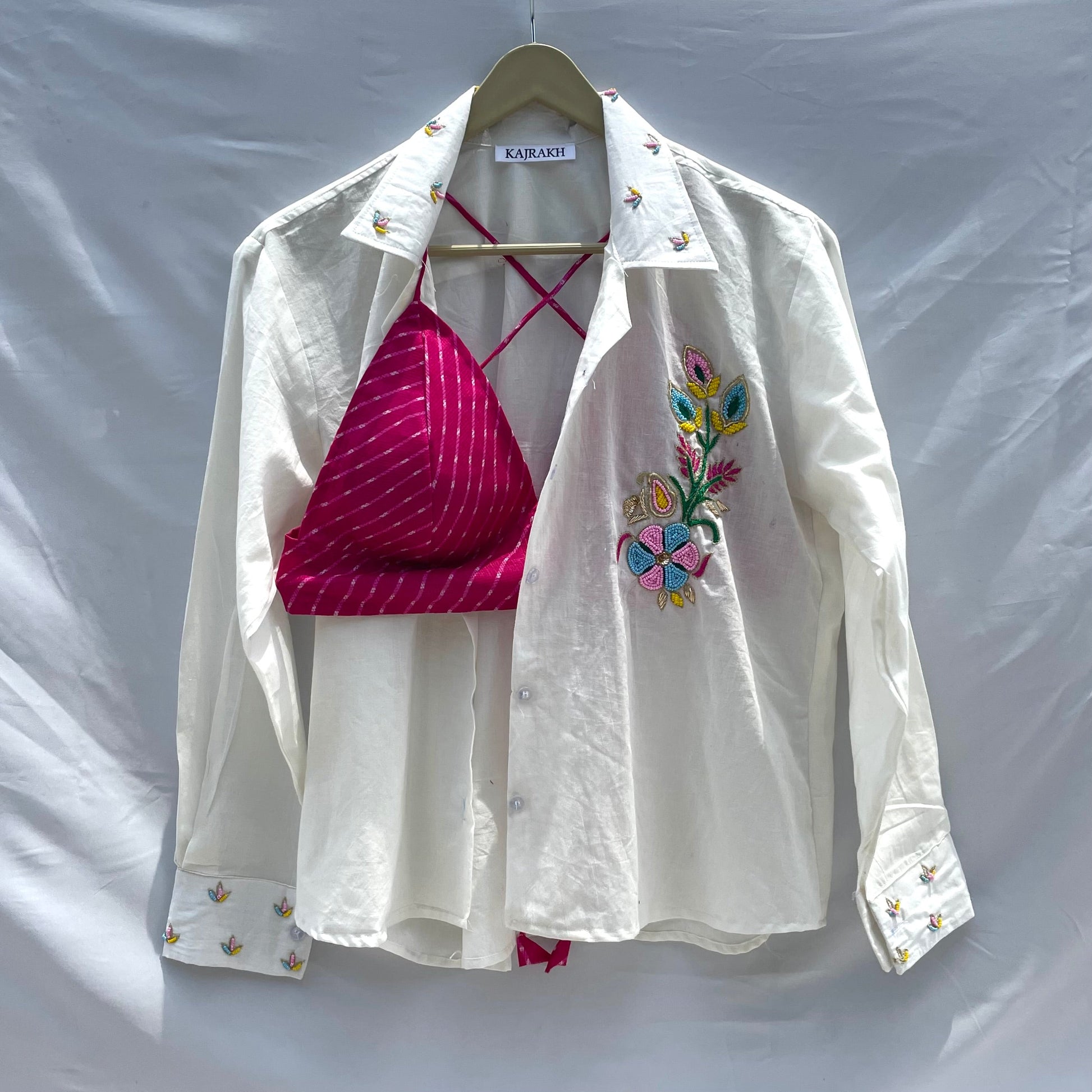 Embroidered Shirt with Pink Lehariya Bralette Combo