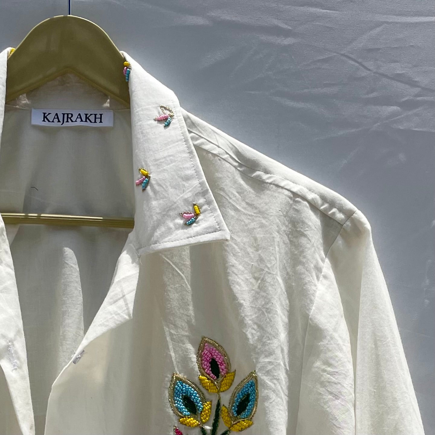 Elevate your style with the Embroidered Shirt with Pink Lehariya Bralette Combo. This striking combo features a beautifully embroidered shirt, adding a touch of intricate artistry and texture, paired with a pink Lehariya bralette.