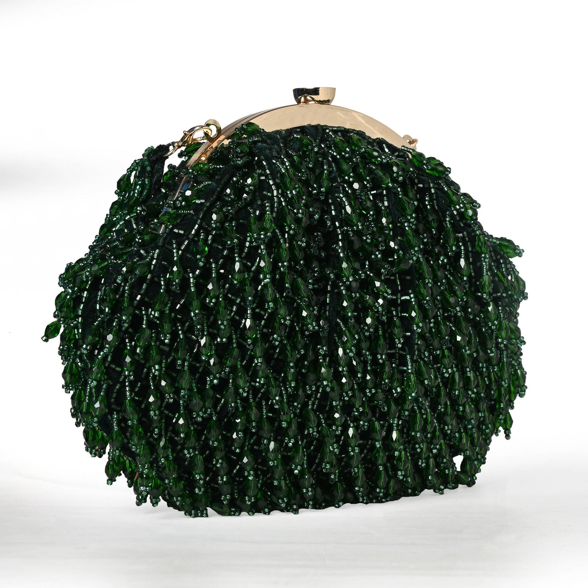 Green Glass Beaded Batua Bag, exquisitely crafted on a velvet base, adorned with shimmering glass beads for an elegant touch. Complete with a short embroidered handle, this chic accessory adds a touch of sophistication to any ensemble.