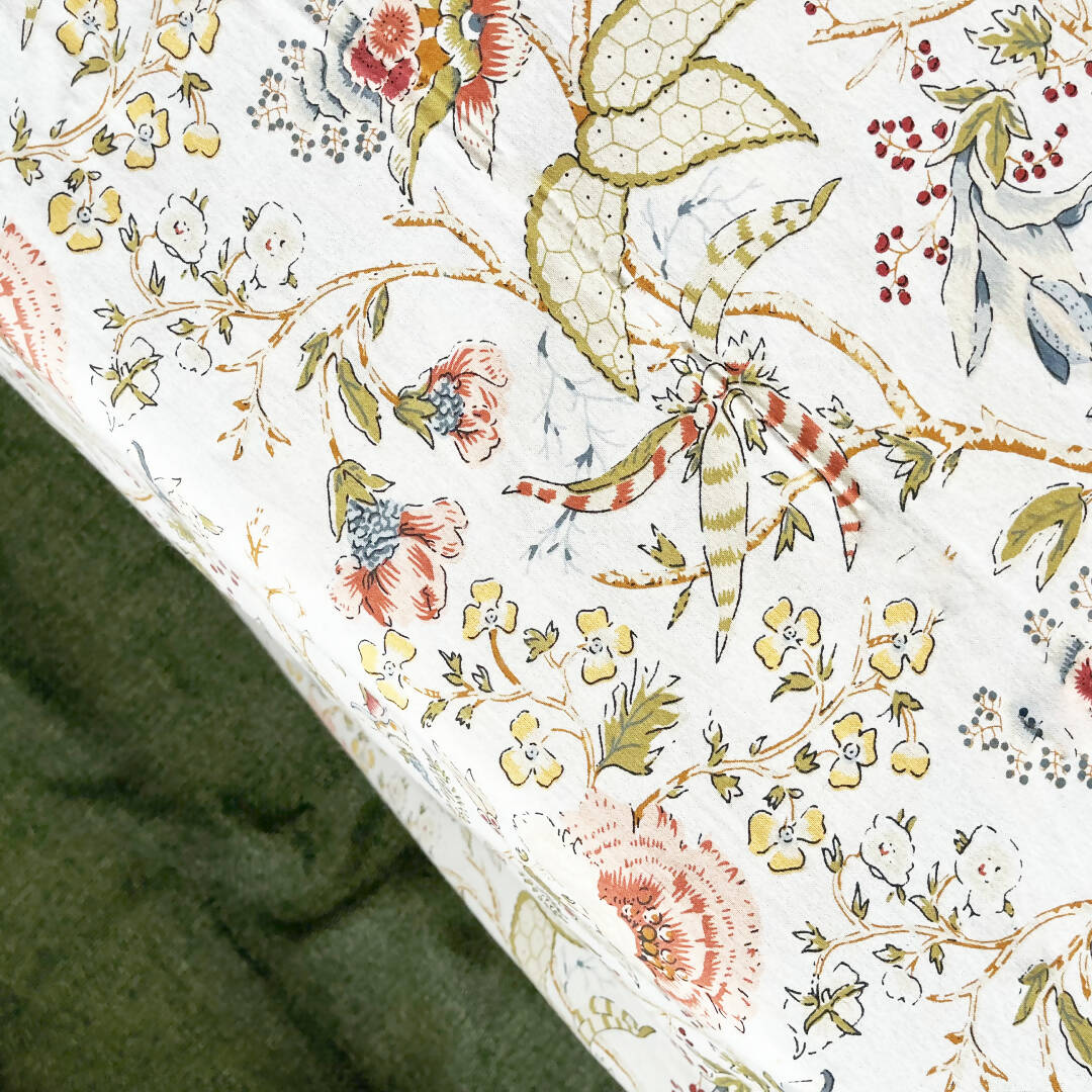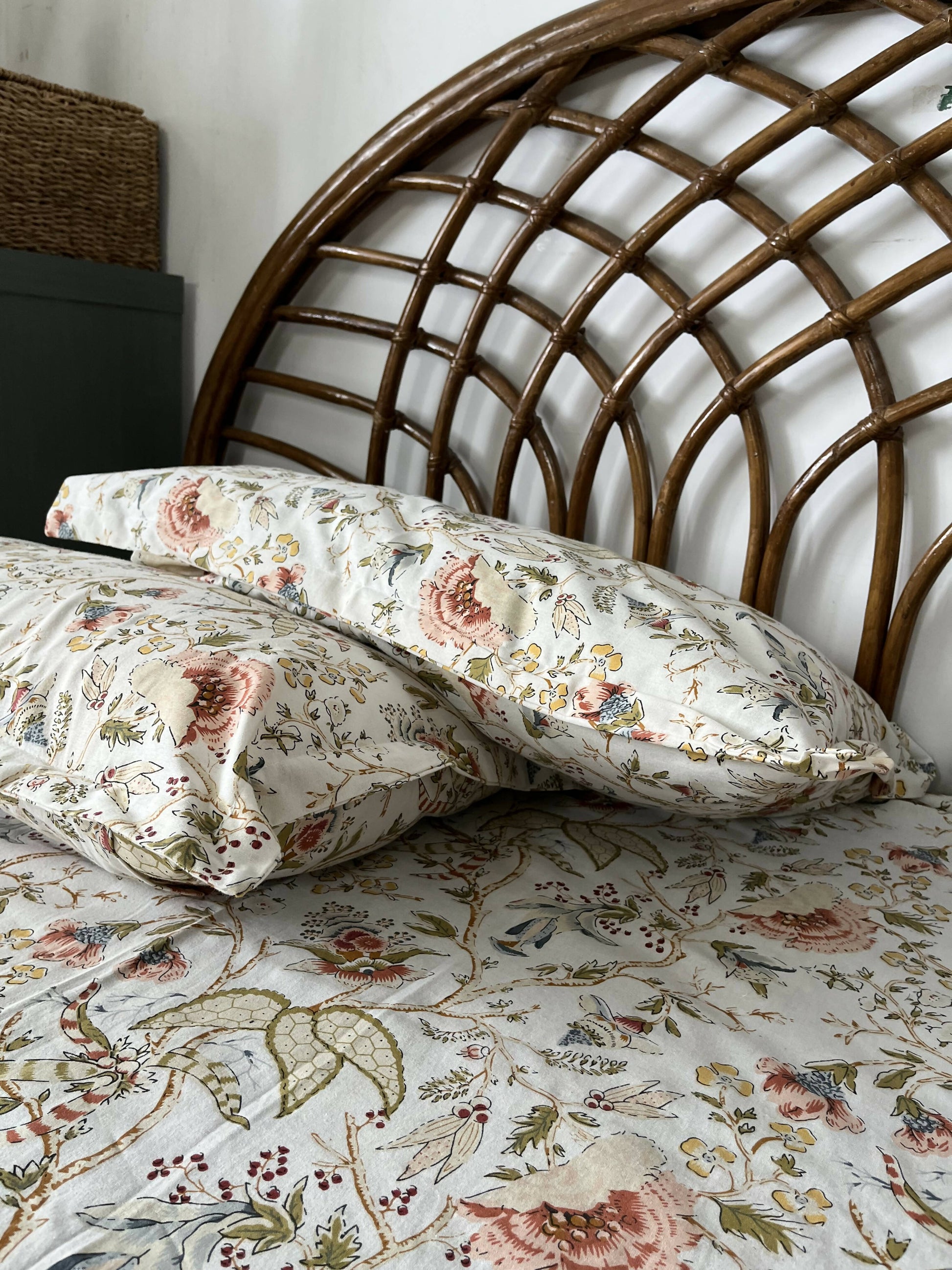 Inspired by the elements of nature which leave us mesmerised, the Enchanted Garden bed sheet set is a beautiful floral printed handcrafted dream. All Saga products are ethically made with efforts and love- this one in particular is a 100% premium cotton double bed sheet with two complementing pillow covers.