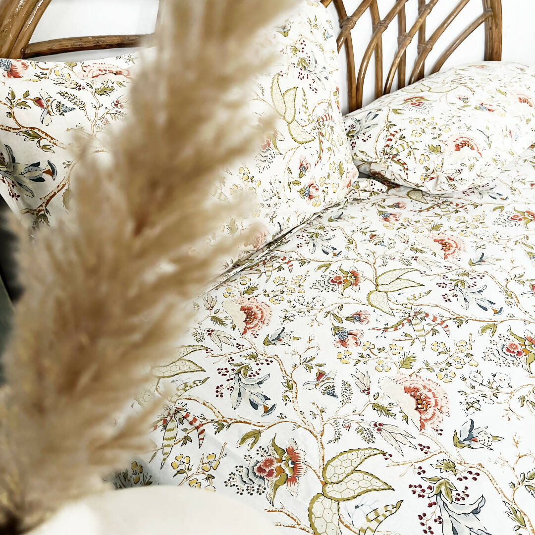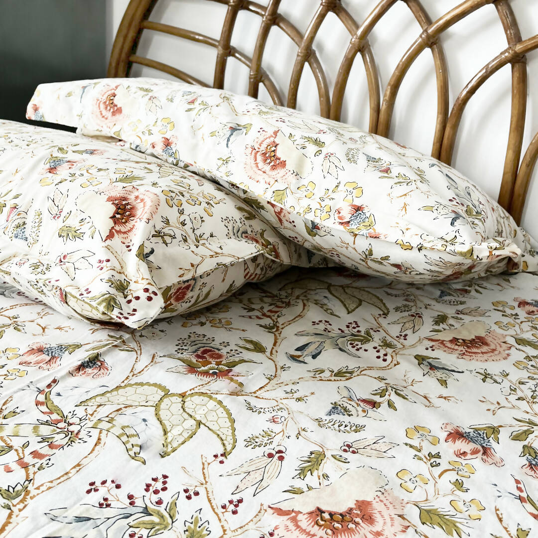 Please remember: Each Saga product is handmade and printed and may have slight or minor imperfections in print or colour. This is a standard characteristic of hand-block printing and should not be considered a 'defect'. Thread count varies between 250-300.