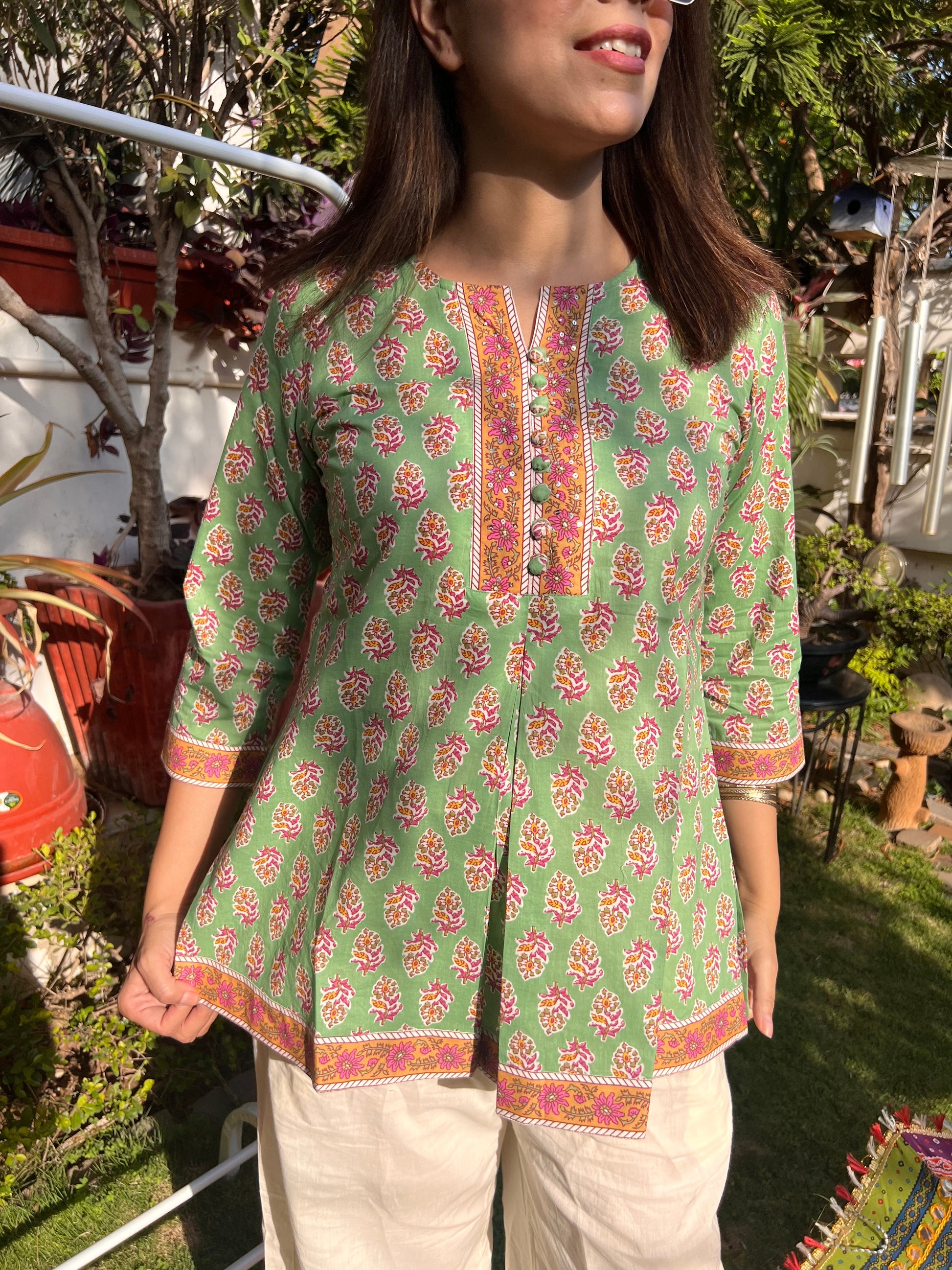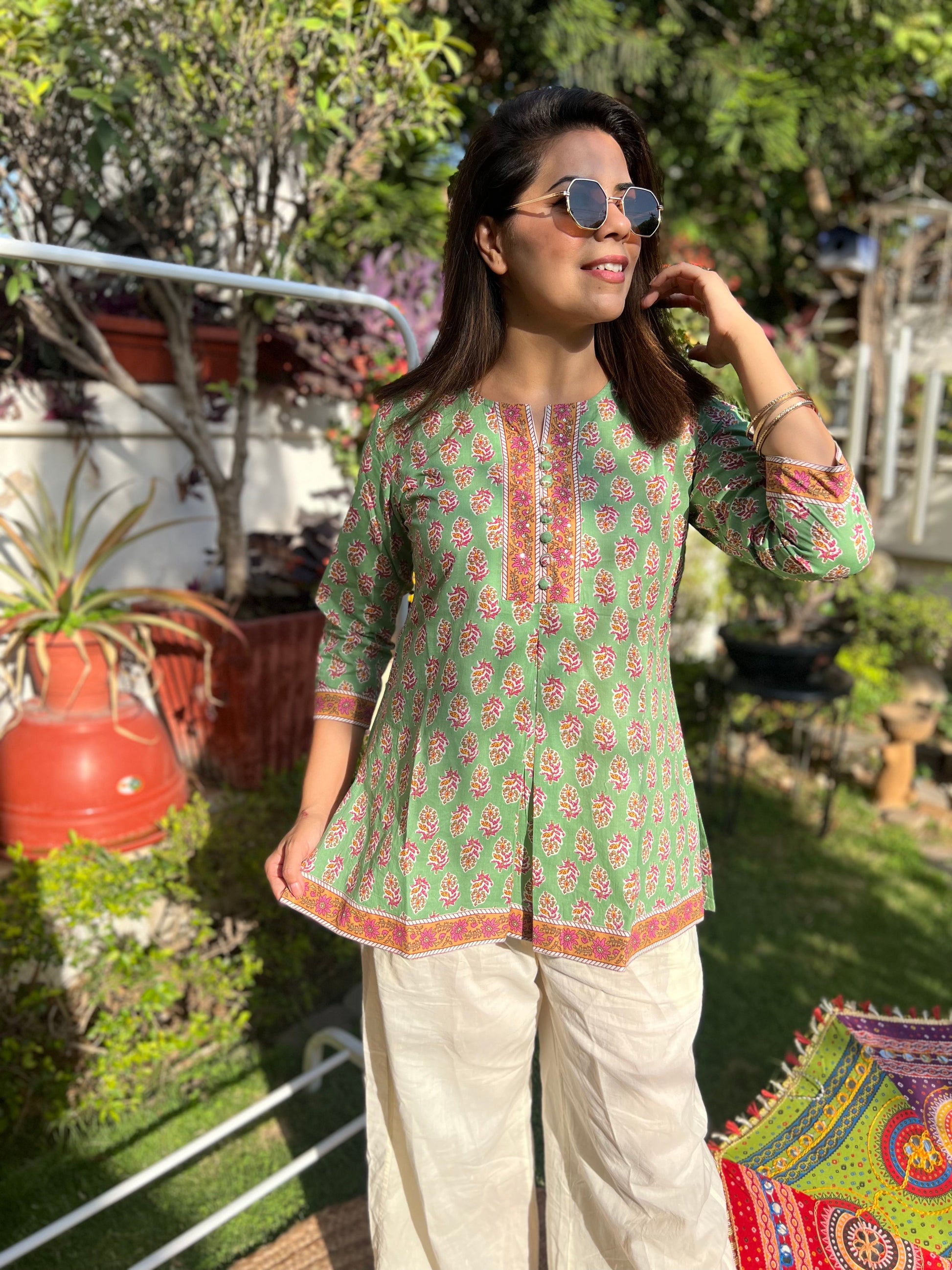 Add a touch of elegance to your wardrobe with this ethnic motifs printed top. Featuring a round neck and three-quarter regular sleeves, it’s comfortable and stylish. The subtle sequinned details give it a hint of sparkle, perfect for any occasion.