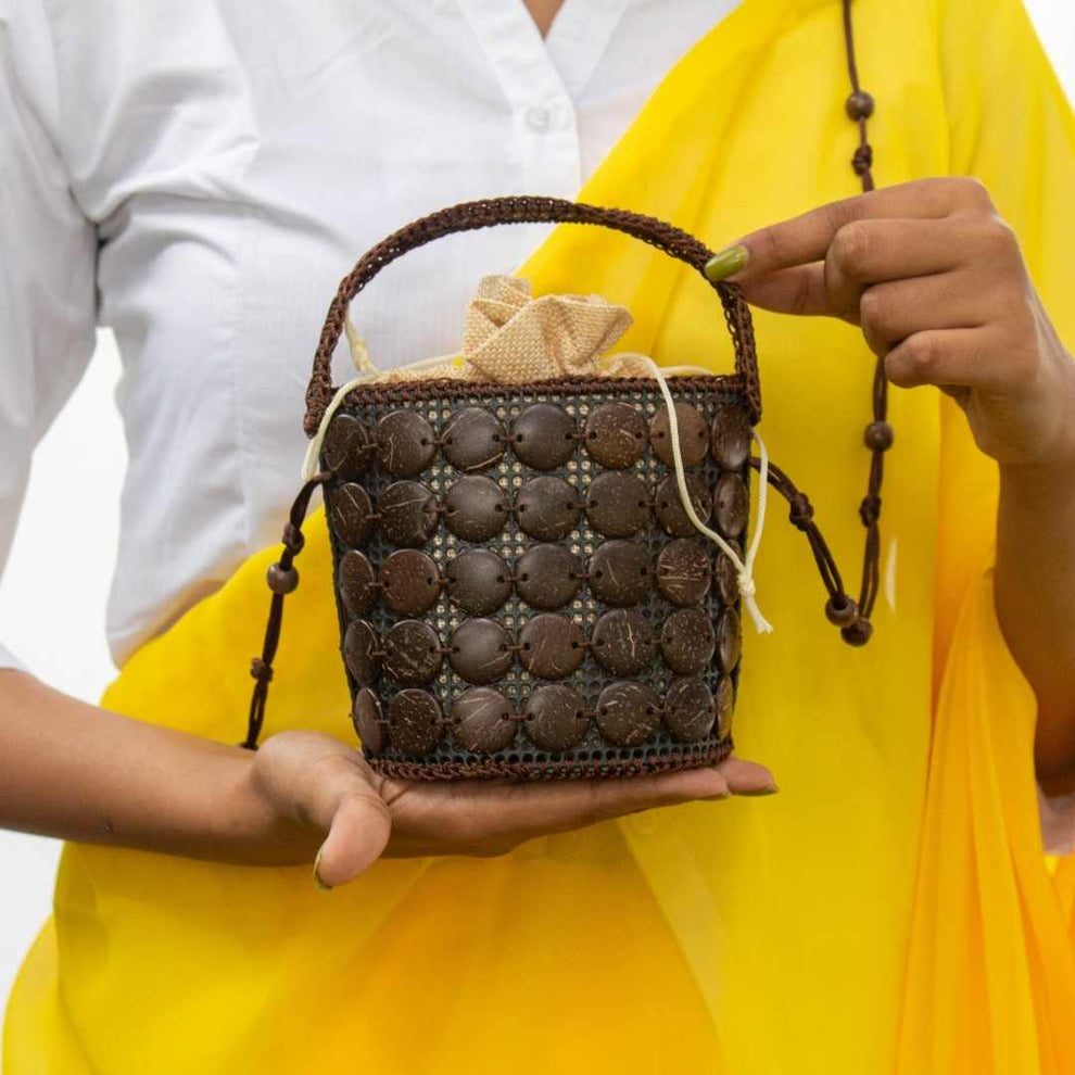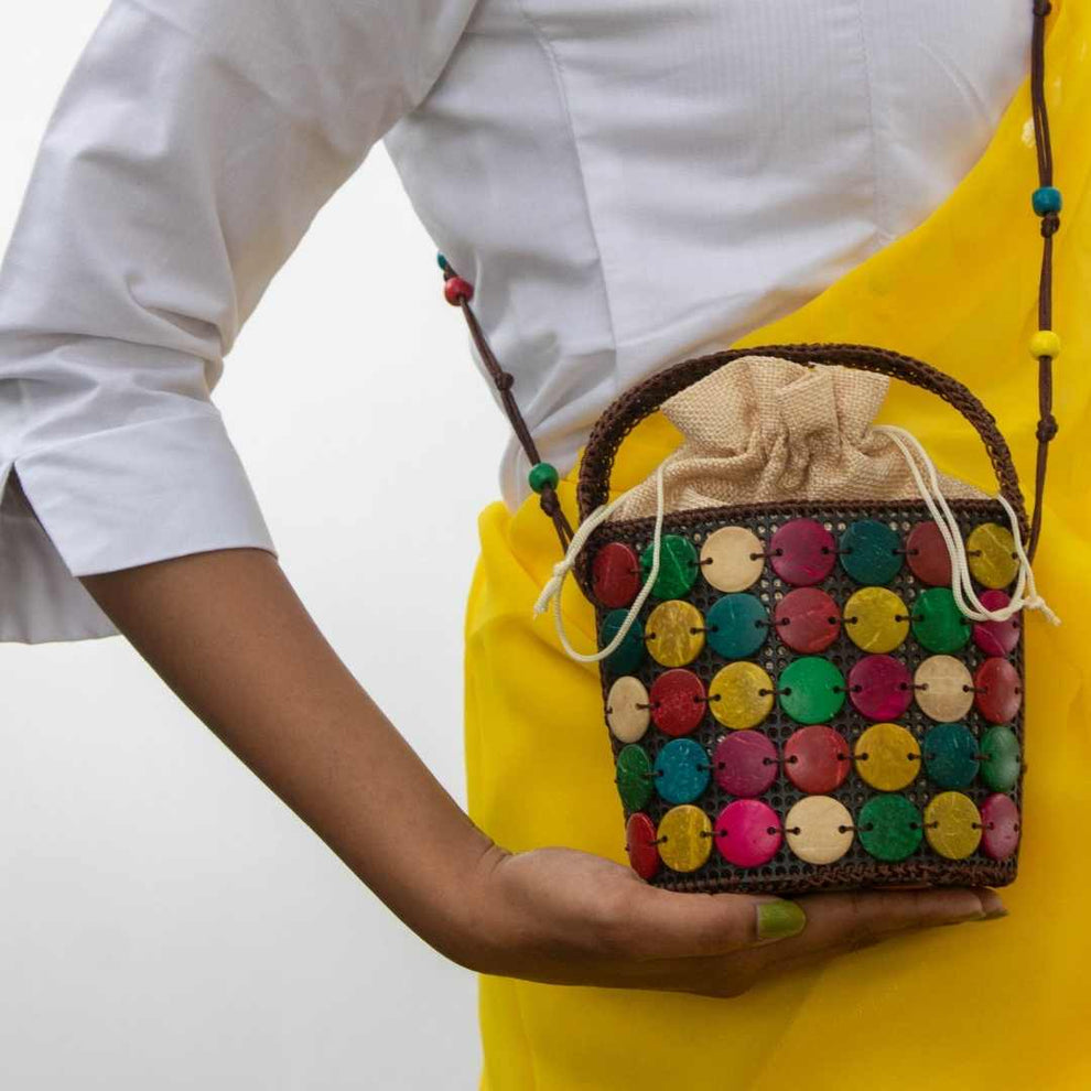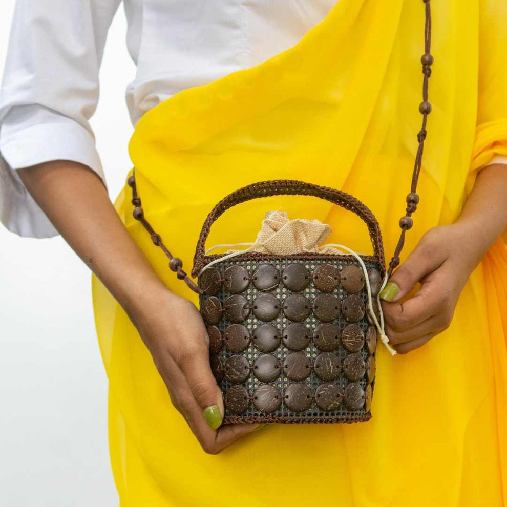Potli bag redesigned. Sustainably stylish.A contemporary potli bag design with coconut shells hand stitched on recycled PU.