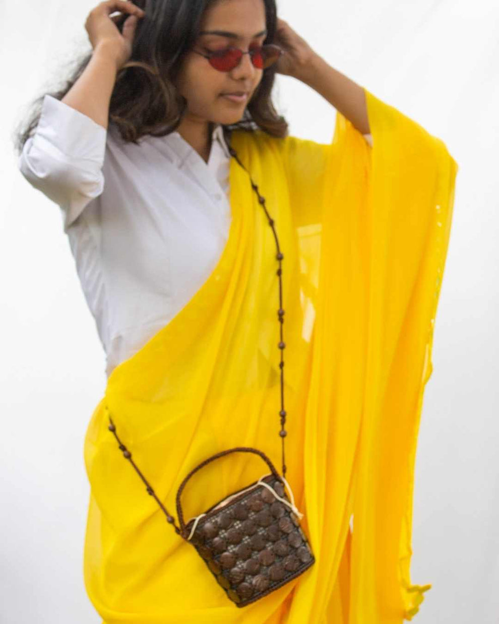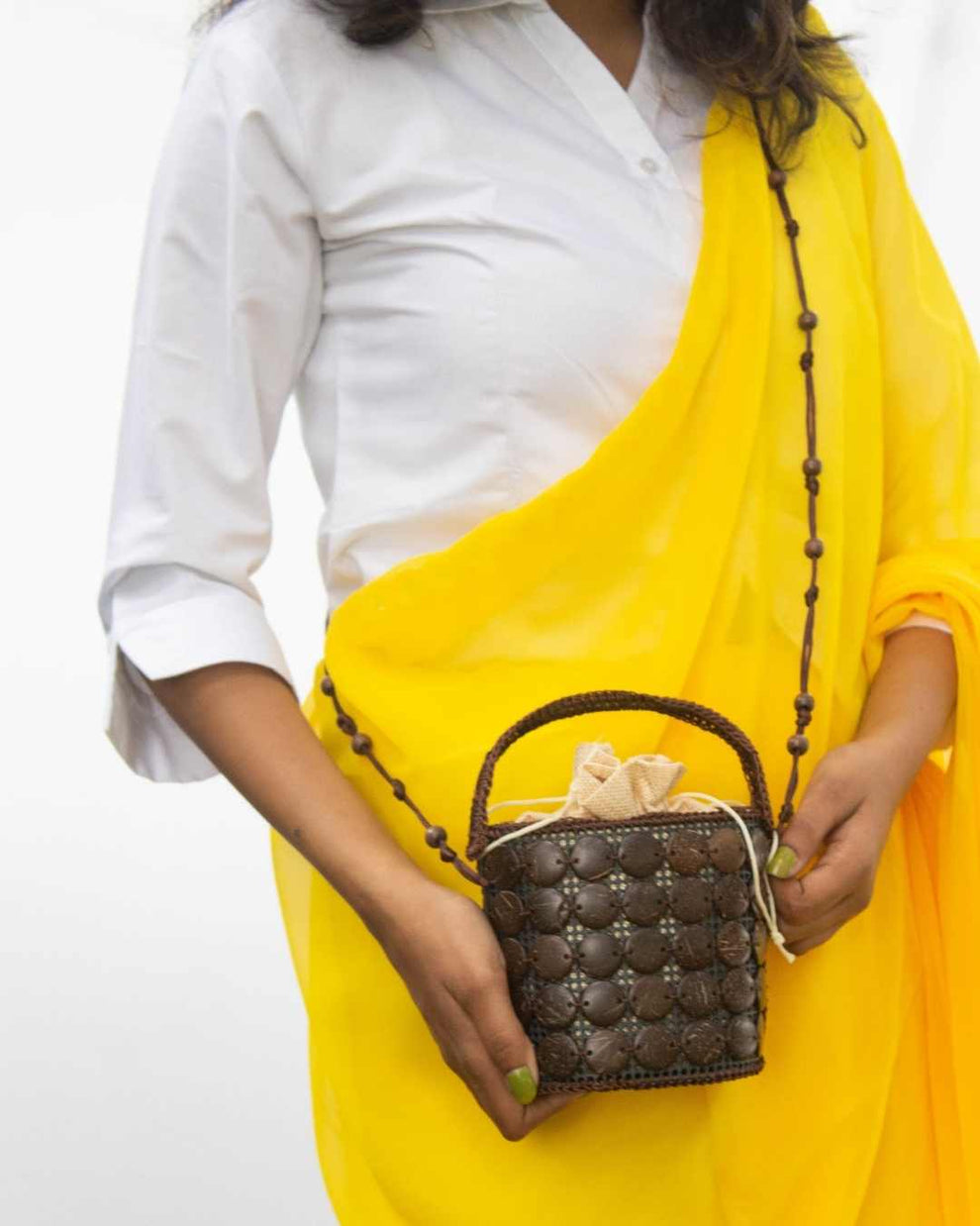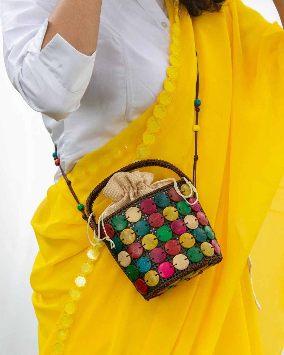 Potli bag redesigned. Sustainably stylish.A contemporary potli bag design with coconut shells hand stitched on recycled PU.
