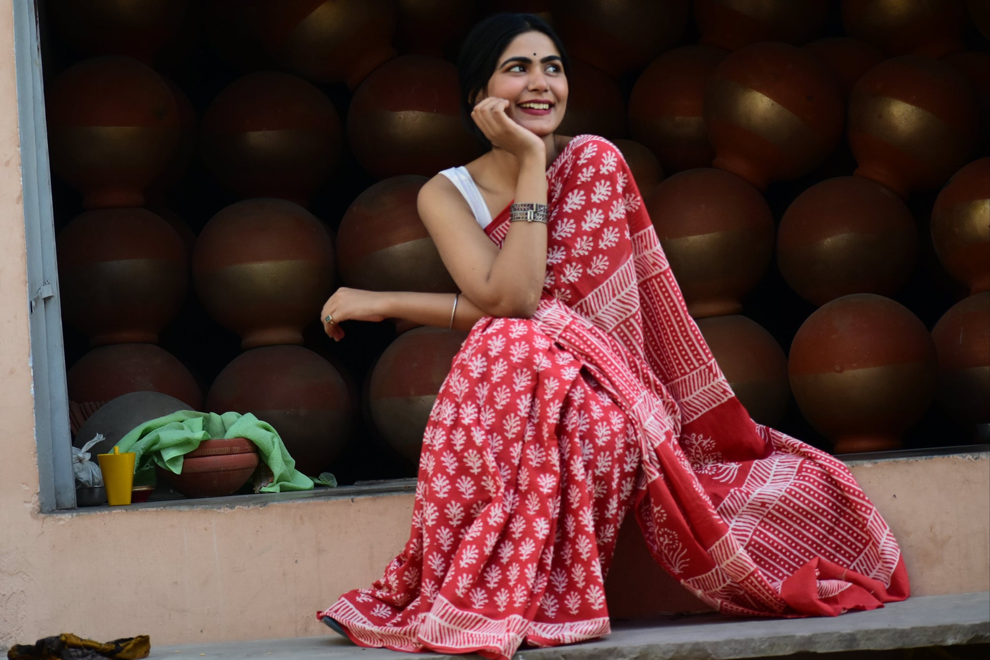 EyeCandy Mulmul Cotton Block Printed Red Saree