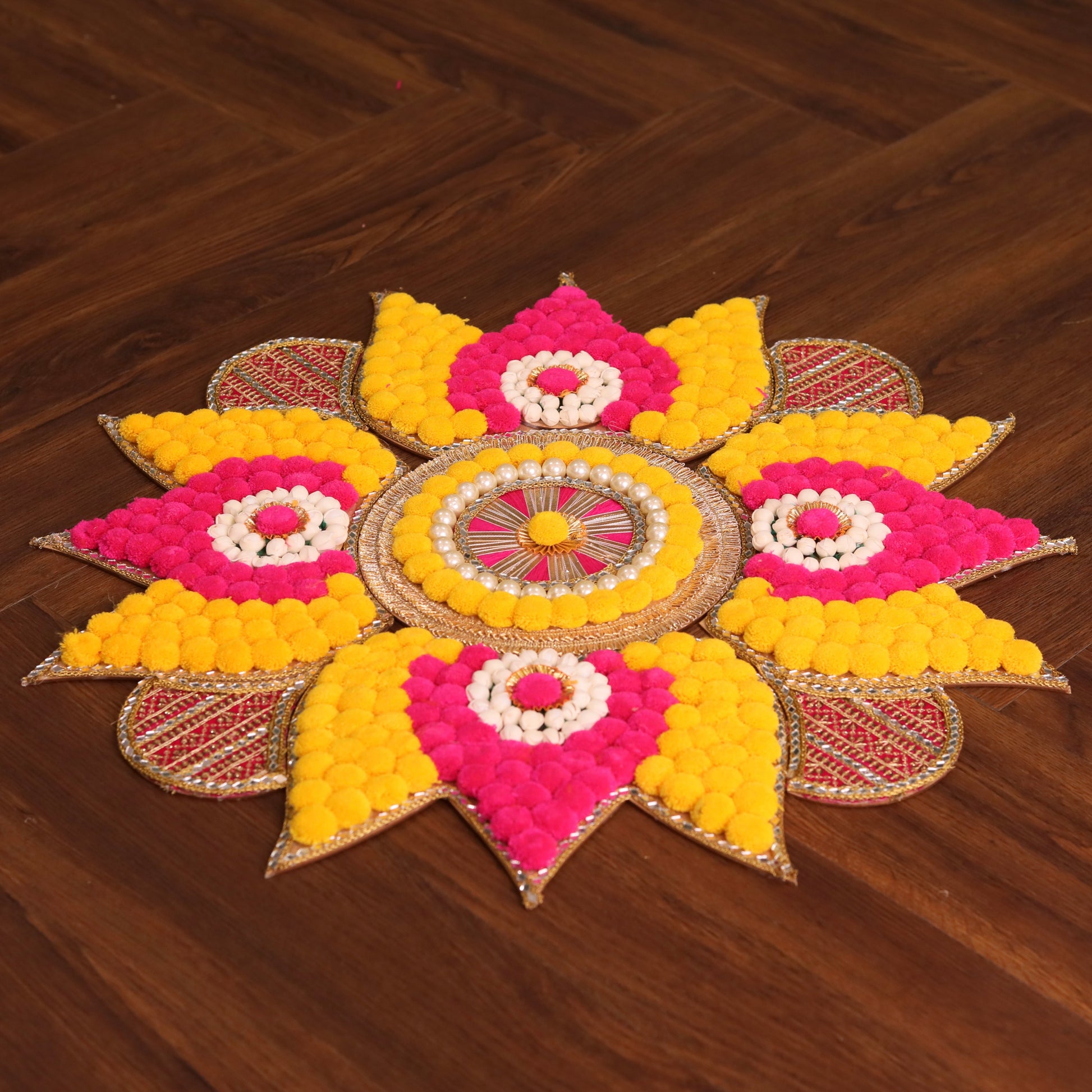 You can choose from a wide range of collections ranging from flower designs, pearls, beads, Kundan, shimmering lace patterns, and much more. You can include these rangolis in your Diwali gift hampers and presents. Pick your favourite from our durable and handy rangolis.