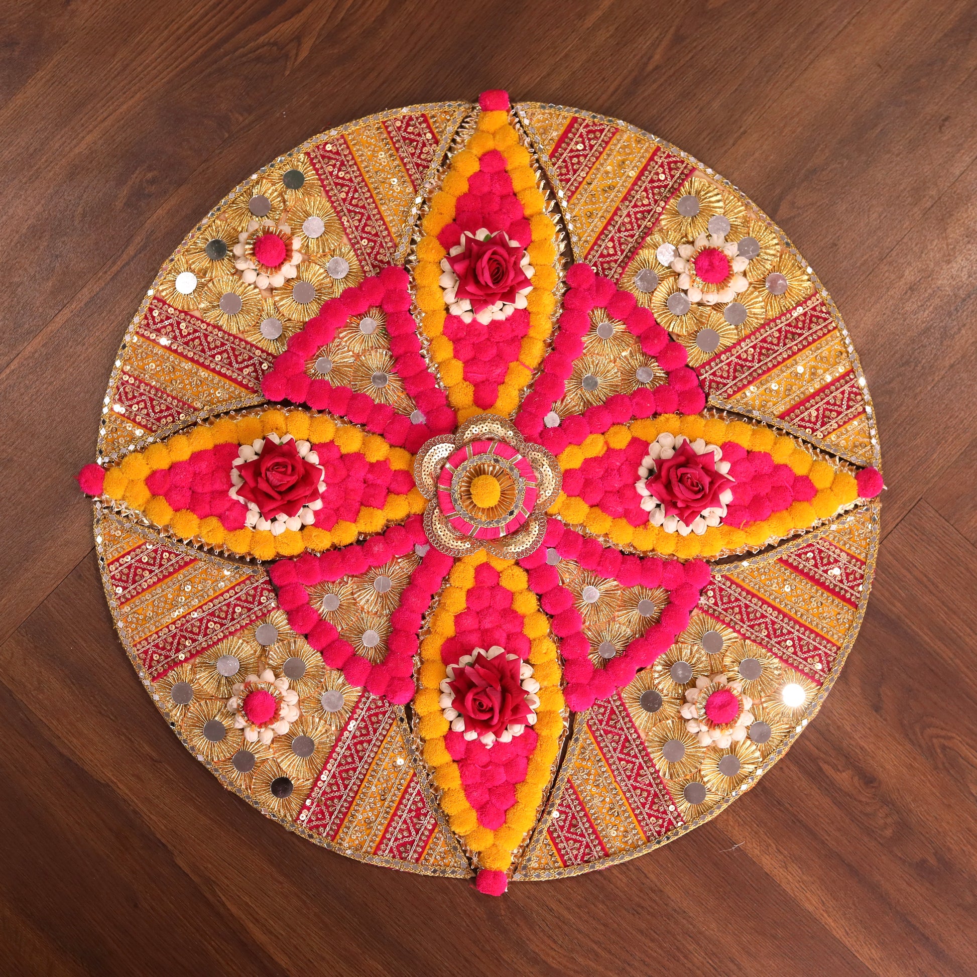 W elcome the Goddess of wealth and fortune Laxmi to your homes with our beautifully designed readymade rangolis'. Each rangoli design is unique and intricately created together by our artisans for you.Available in different prints and vibrant colors, these Rangolis' will add zest to your festivals and home decor.