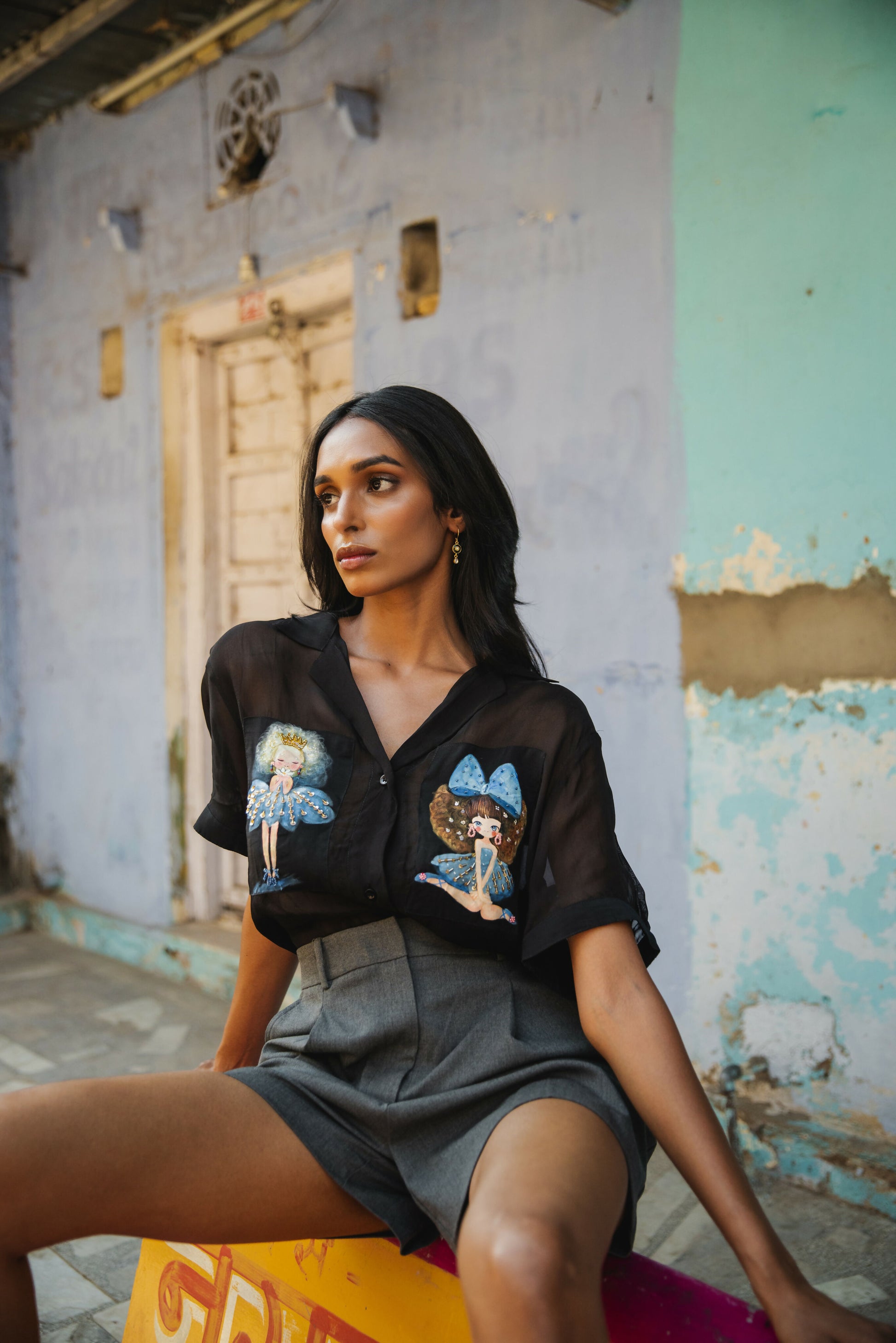 Introducing the Fiona Organza Black Hand-Painted Shirt which features enchanting hand-painted fairies and intricate hand-embroidered details. Crafted from soft organza, the Fiona shirt combines artistry and elegance, making it a perfect statement piece for any occasion.