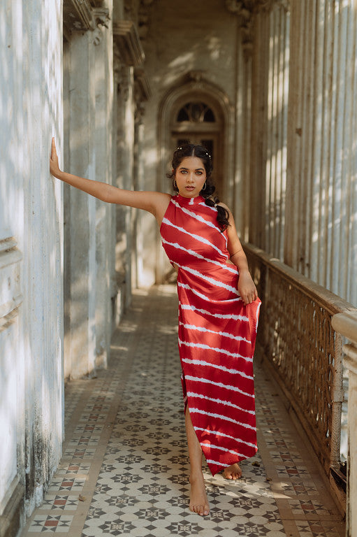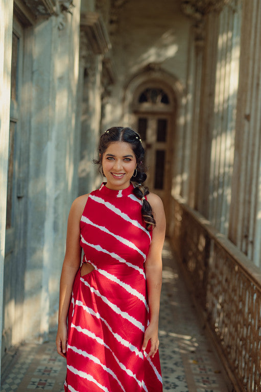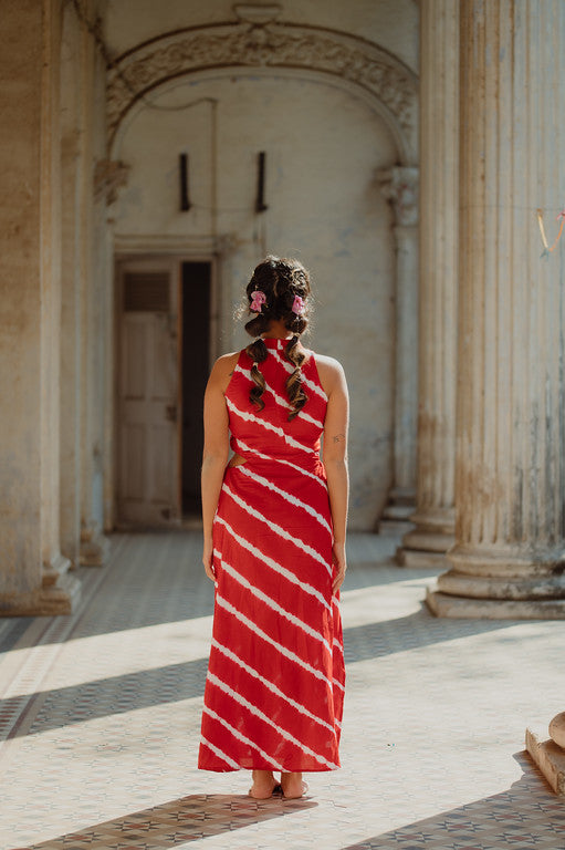 Featuring the ever-stylish leheriya print on cotton maxi dress, the fabric sets beautifully over your silhouette, giving you a chic look. Elevated with scalloped cut-outs at the waist, the dress starkly defines your bodice. Can be styled as perfect sundress apparel or ethnic wear paired with sleek pants.