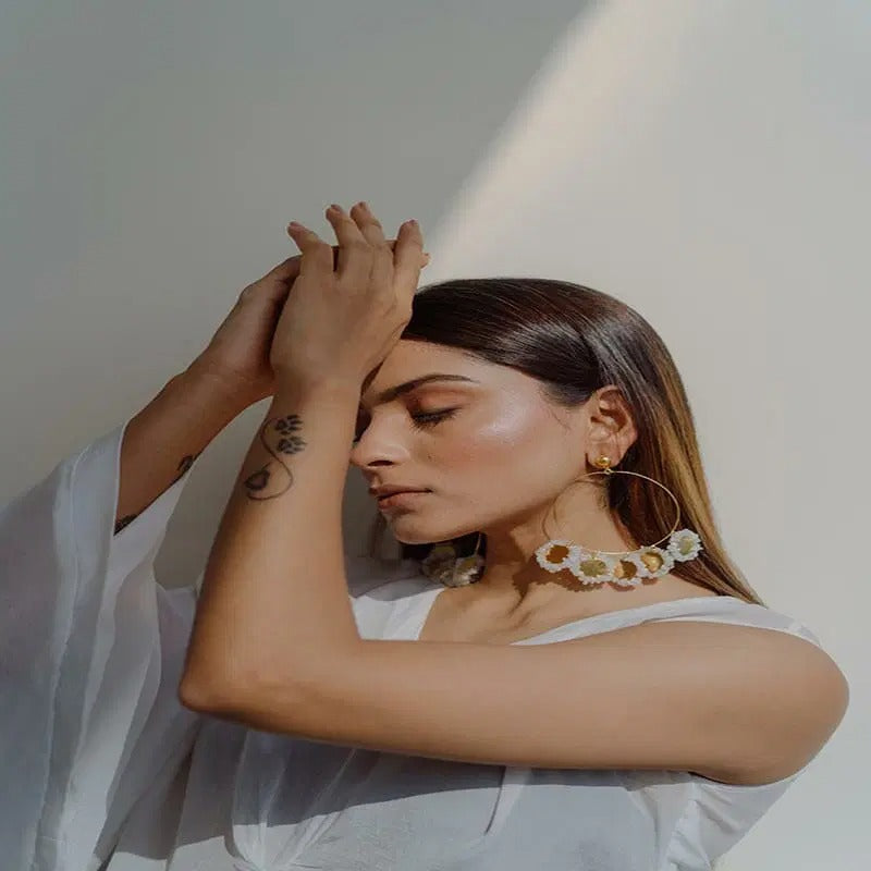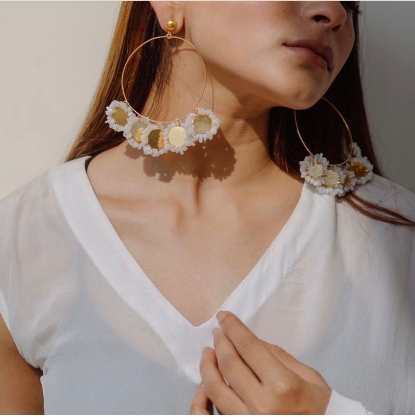 Oomph! Your traditional look with this new contemporary set of oversized hoop earring. \n \nGanesh inspired design to enhance your beauty made with white moonstones and brass coins