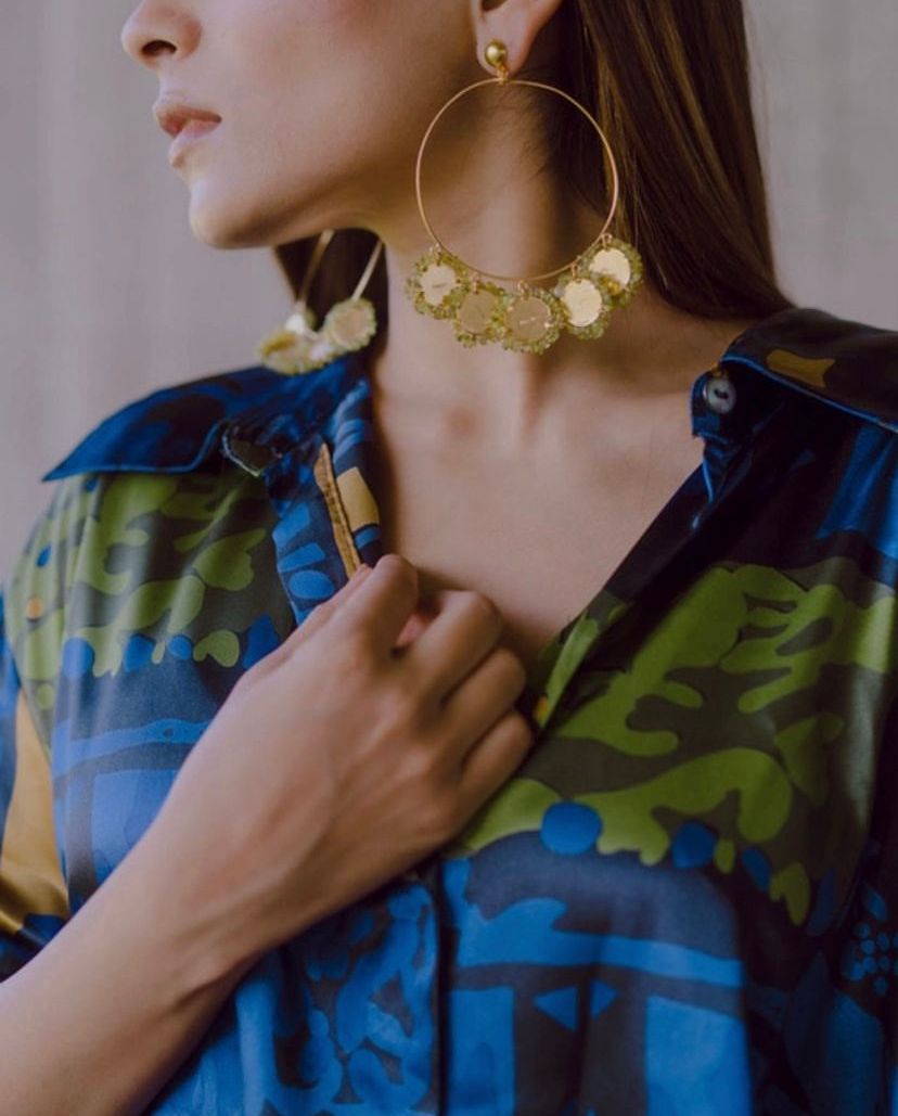 Oomph! Your traditional look with this new contemporary set of oversized hoop earring. Ganesh inspired design to enhance your beauty made with white moonstones and brass coins