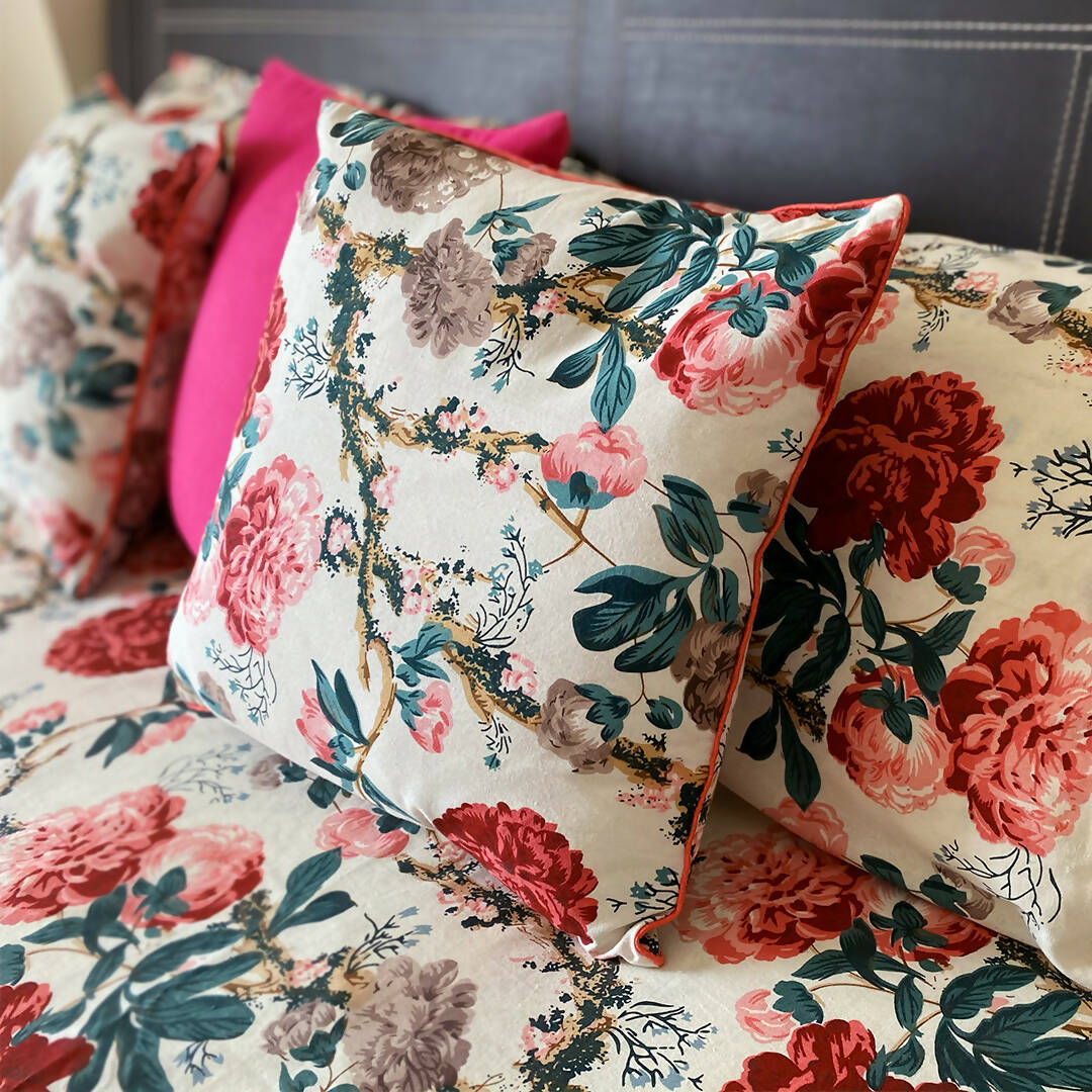 Bring the divinity and warmth of blooming flowers to your home with the Floral Bloom Collection by Saga. Large floral motifs and exquisite print quality are just the top two things at the top of our minds that make this Cushion Cover set worth it. All Saga products are ethically made with efforts and love- this one in particular is a 100% premium cotton Cushion Cover with constrasting colored piping at all its sides to make it shapely.