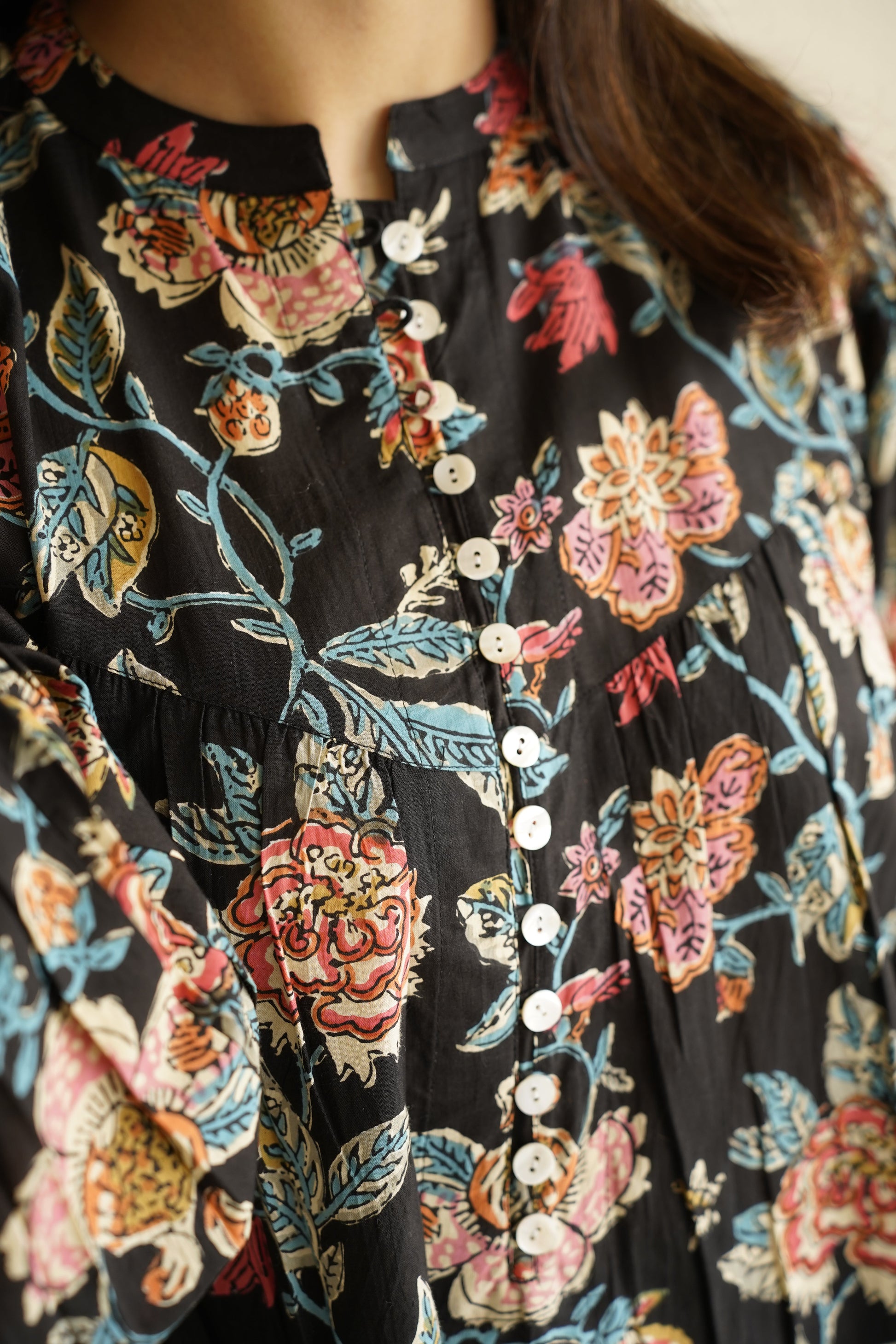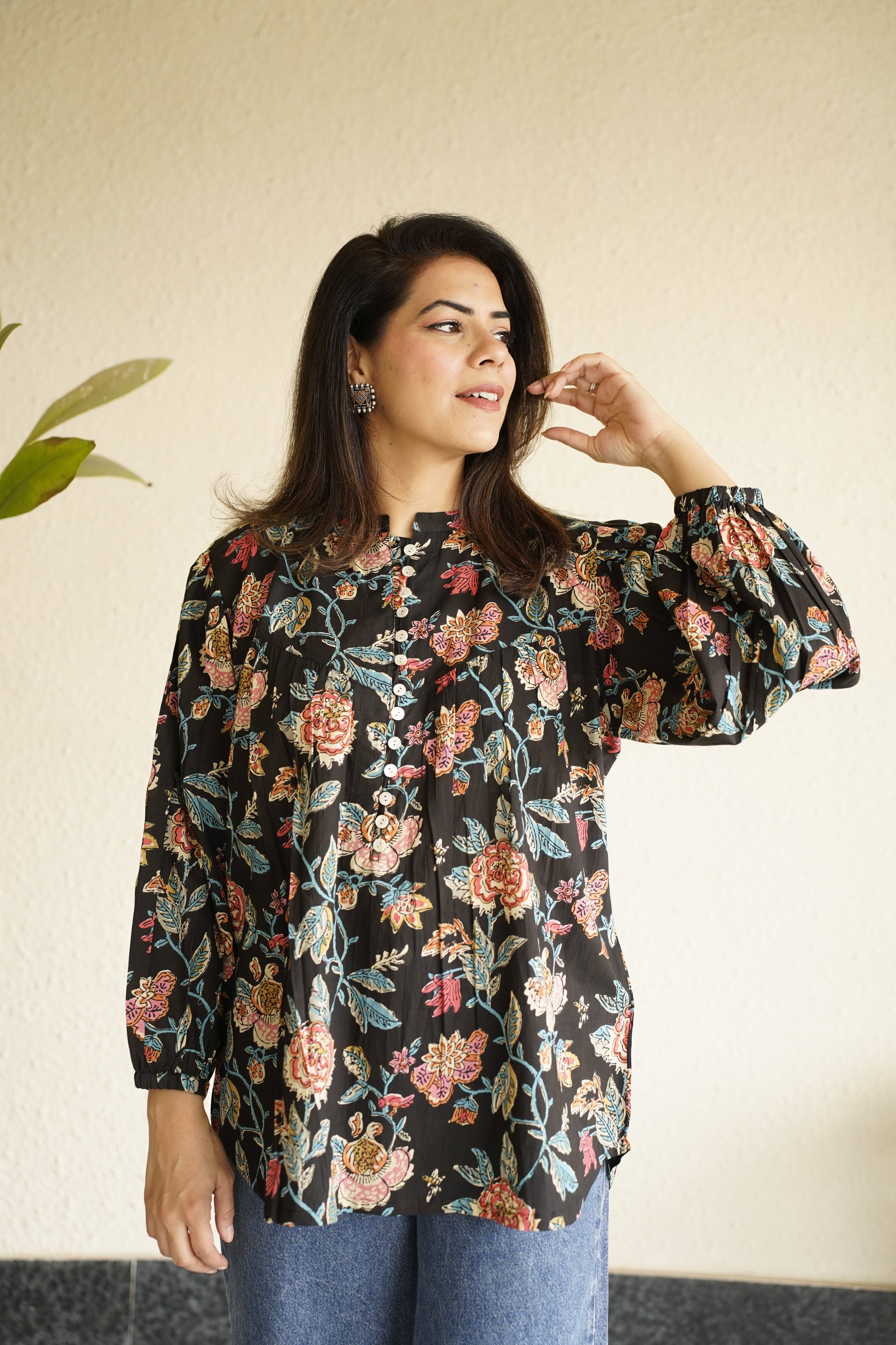 Add charm to your wardrobe with this cotton top featuring a beautiful floral print. The mandarin collar and three-quarter gathered sleeves give it a trendy yet classy look. Made from soft woven cotton, it's comfortable and perfect for casual outings or a stylish day at work!
