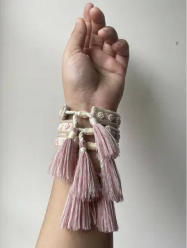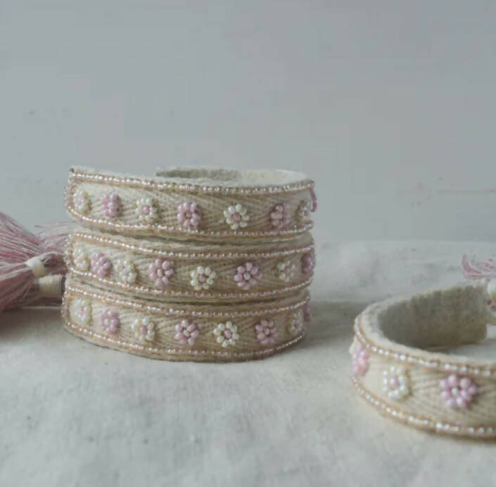 This one size fits all handwoven band has flower motifs embroidered on it using glass seed beads. The base of the band is off white with flowers beaded on it in pink and off white. It is outlined with clear glass beads. The band has matching tassel ends and comes with an adjuster to fit any wrist size perfectly. These beaded woven bracelets can be worn alone or stacked with other hand accessories.