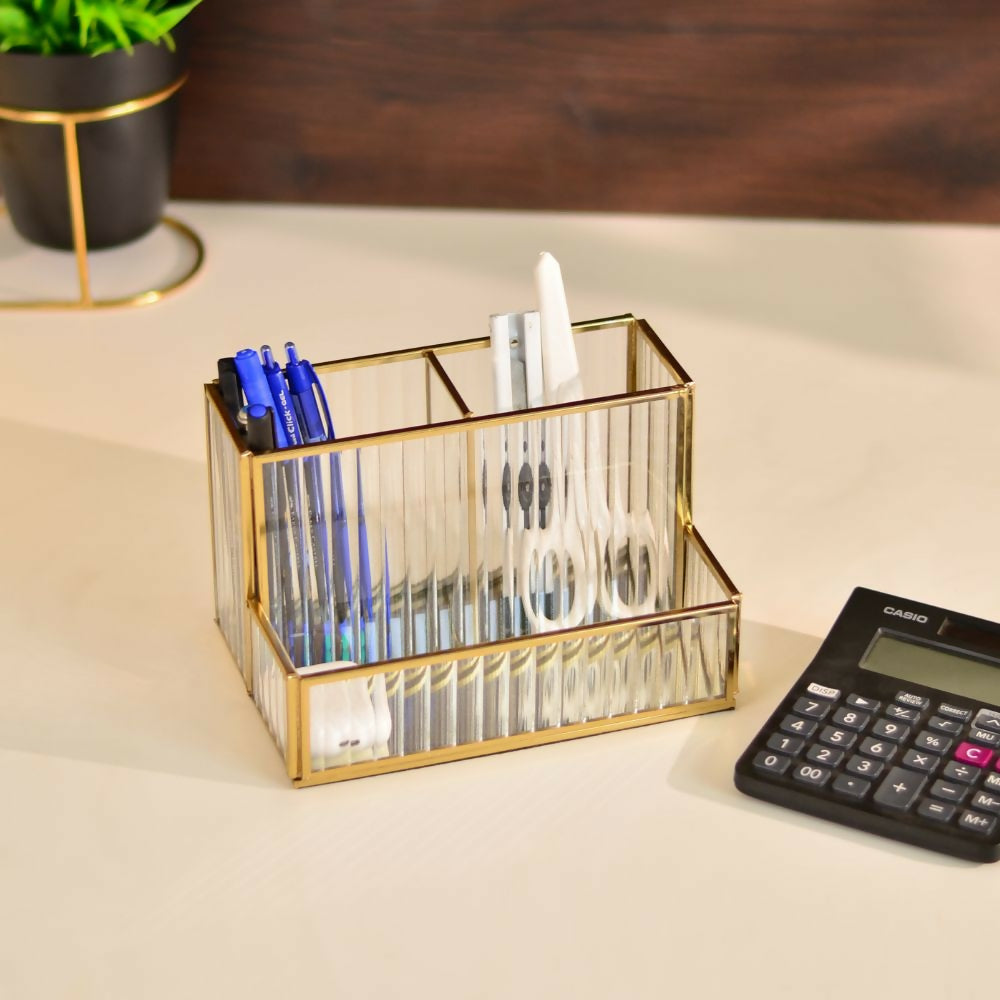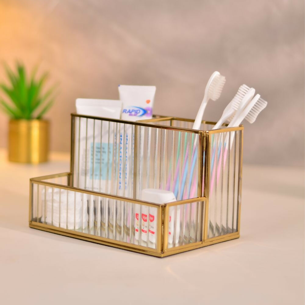 This Fluted Glass holder has versatile uses from keeping items like decoration in living room or organising your toiletries in your bathroom or a make up brush holder or a stationary organizer. This size is also perfect for small spaces like your wardrobes.