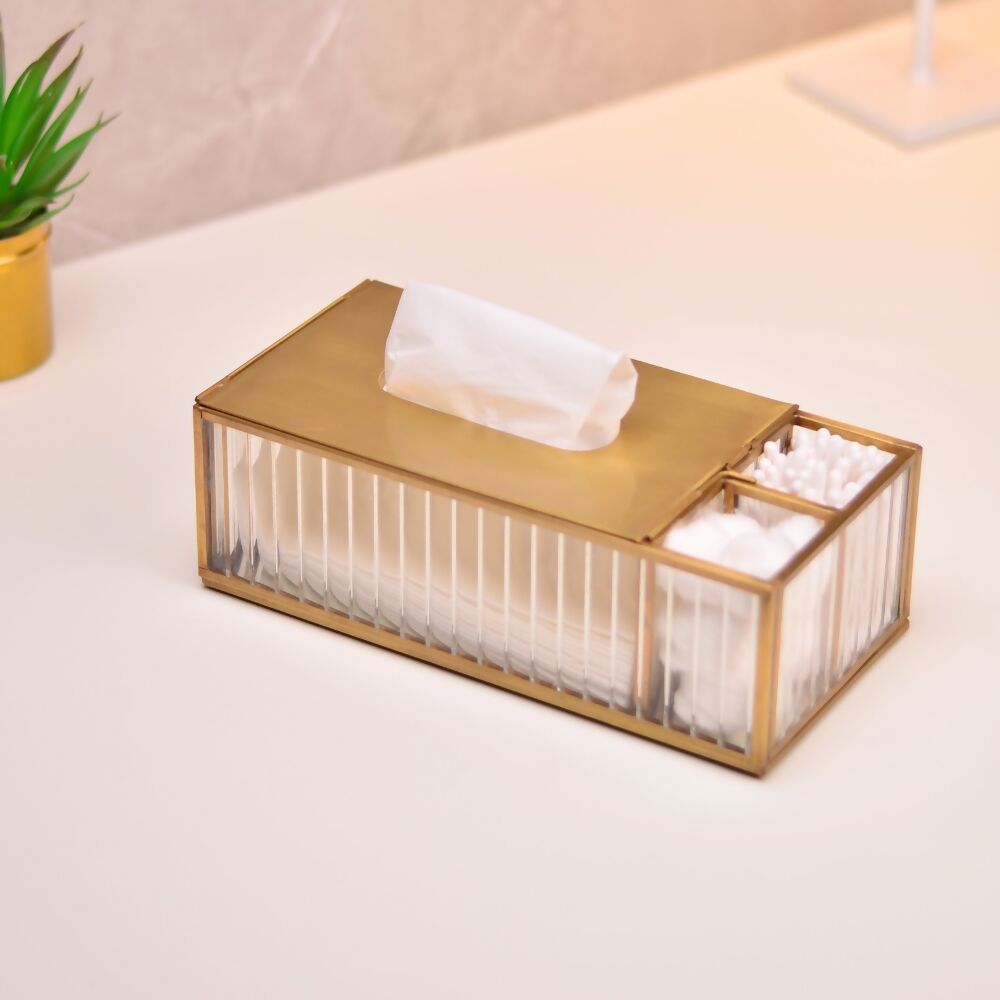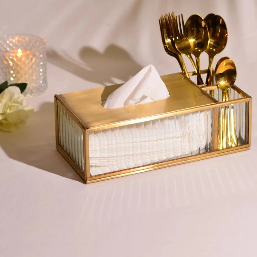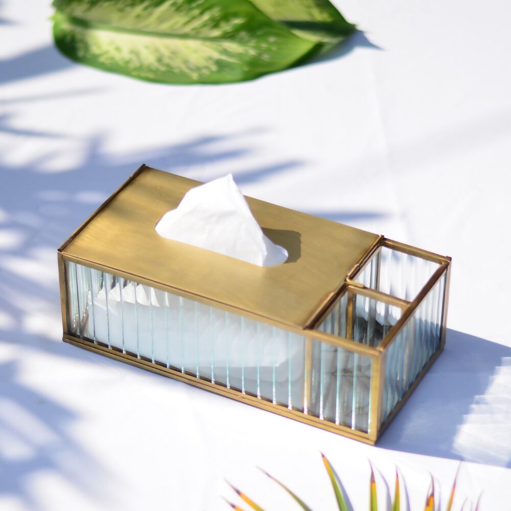 This tissue holder a powerhouse resource for organisation. It has multiple uses: keep it in your living room, bedroom, bathroom or your kitchen. This size is also perfect for small spaces like your wardrobes or dressing areas. This small tray has versatile uses from keeping items like keys/wallets on entry, to decoration in living room or organizing your toiletries in your bathroom. This size is also perfect for small spaces like your wardrobes. Crafted from high-quality materials i.e. brass and fluted glass, this tissue box offers excellent durability, ensuring it remains a reliable companion for all your gatherings and events. The multipurpose design makes it suitable for various settings and applications. Use it in your office, kitchen, bathroom, craft room, or anywhere you need efficient organization and cleanliness.