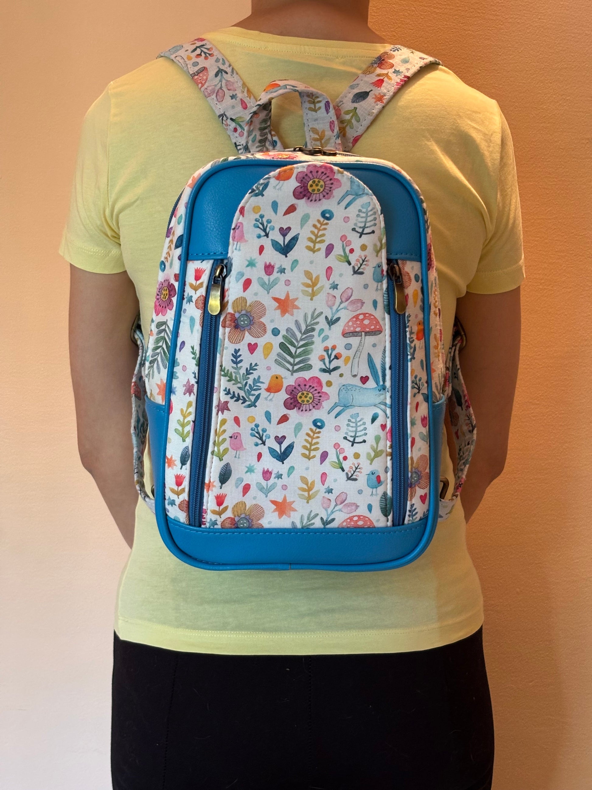 Whimsical and full of charm, the Forest Friends Backpack features a woodland-inspired print with florals, bunnies, mushrooms, and birds on a soft cream base. Bright blue faux leather adds a playful contrast. With adjustable straps and dual compartments, it’s designed for both fun and functionality in your everyday adventures.