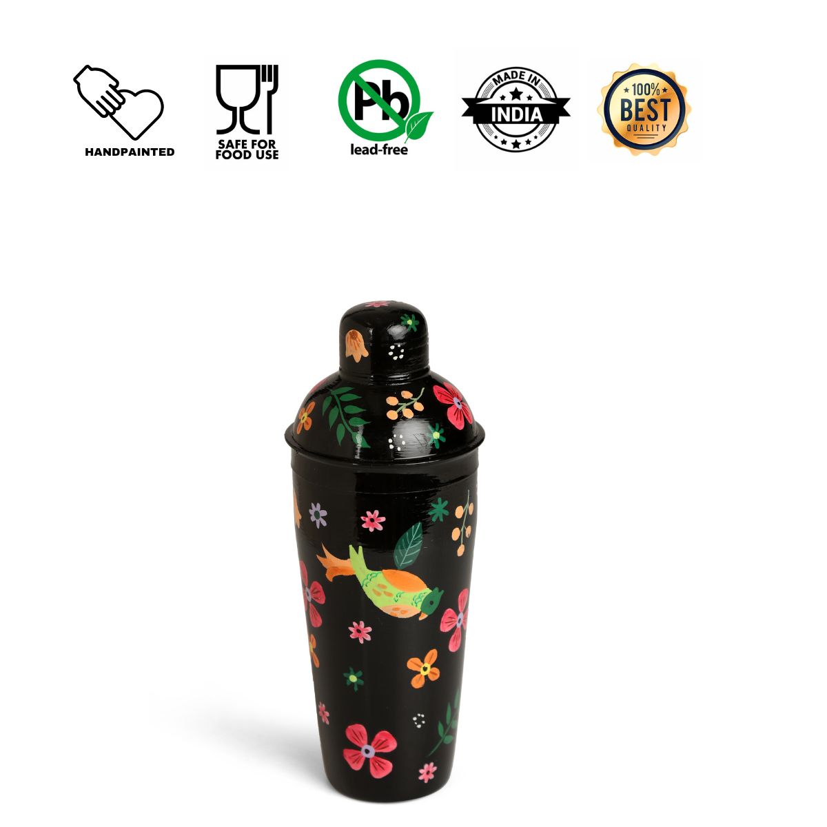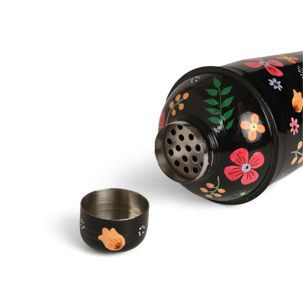 Bring forth your inner mixologist and shake some delightful cocktails at the watering hole of your midnight celebrations. The enameled stainless steel cocktail shaker has been hand-painted by our artisans and peppered with motifs of leaves and flowers that grow in the wild splendidly on a dark base, much like the glittering guests lighting up your soirees.