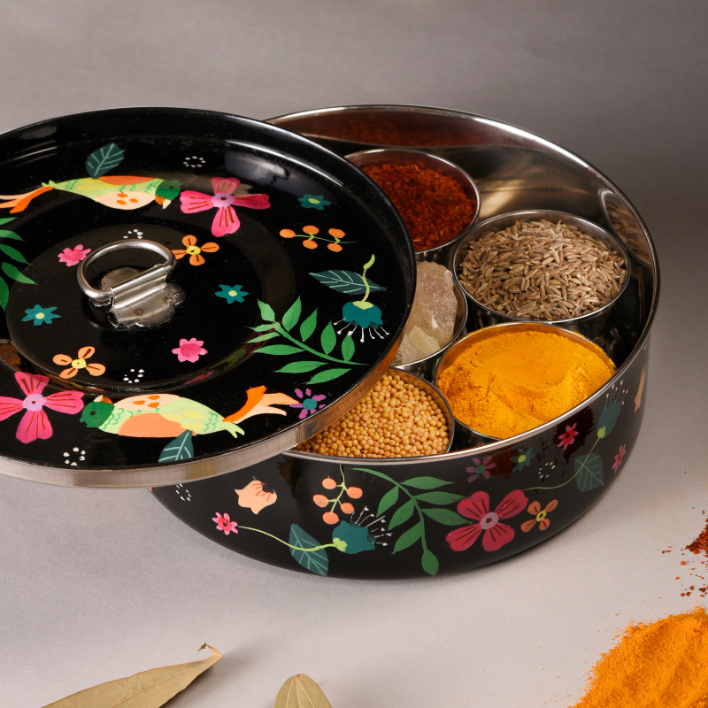 The brightest, most colourful and aromatic essence to Indian cooking, the spices require a special space in your kitchen. Elevate your traditional masala dani with an enameled stainless steel one, hand-painted by master artisans with motifs inspired from the Forest of the Night – bright birds, stylised flowers and leaves in the brightest of hues popping splendidly on a dark base.