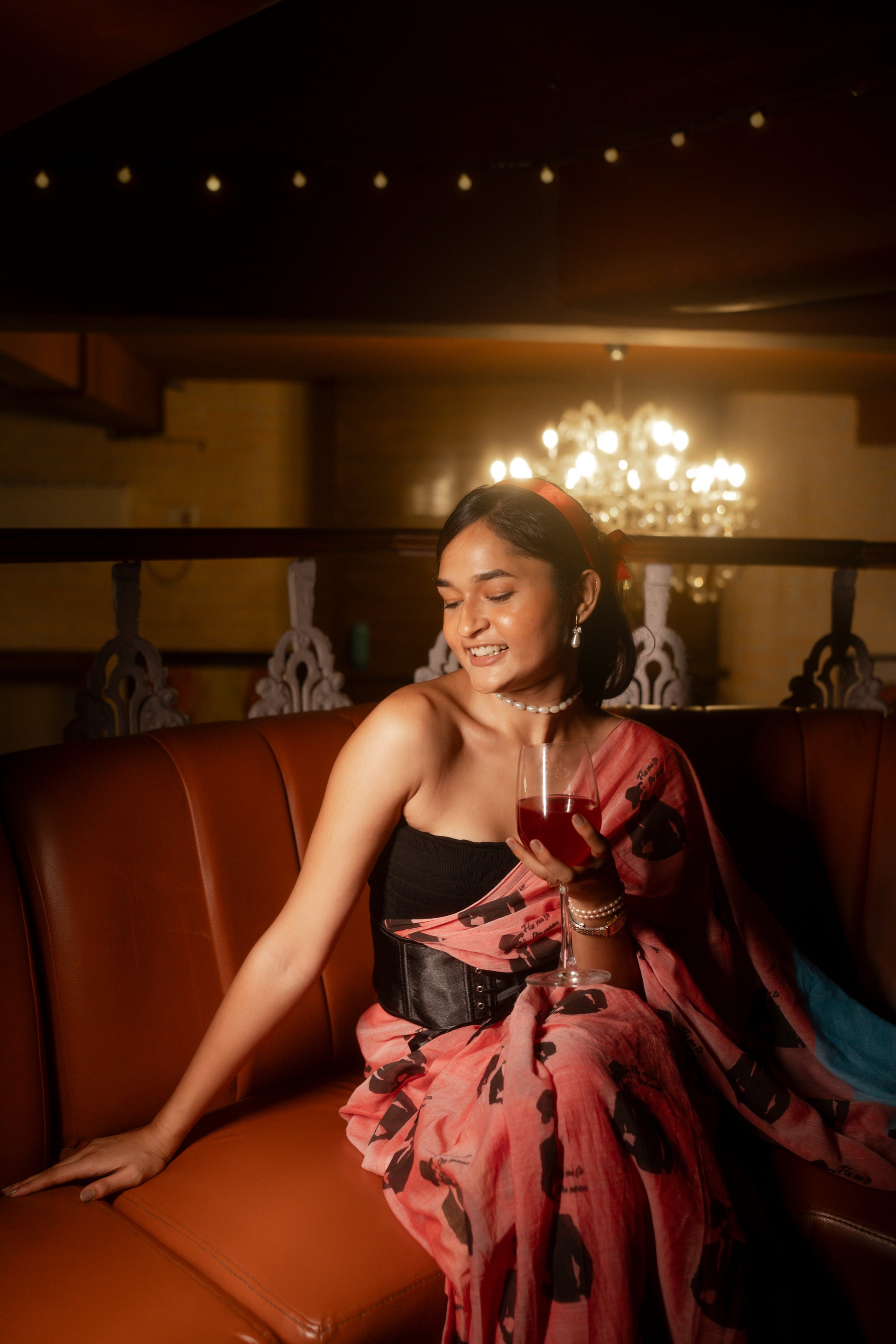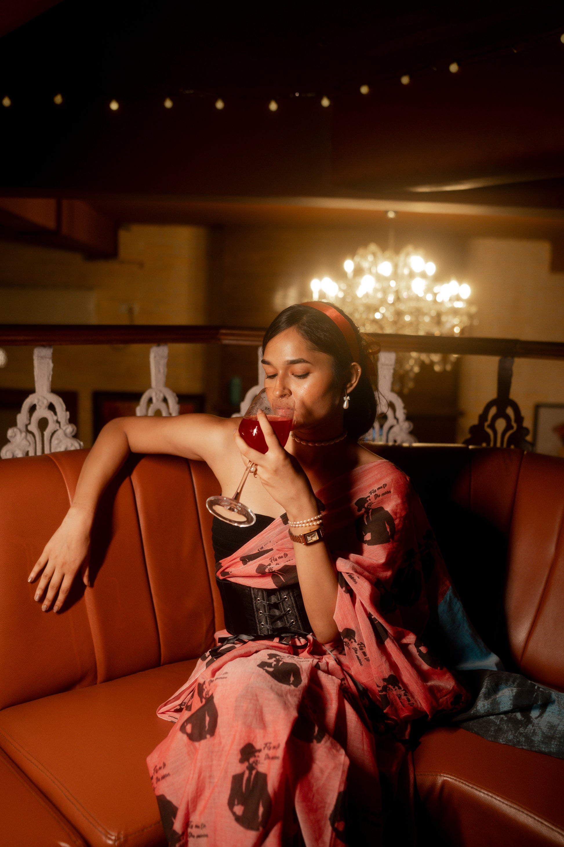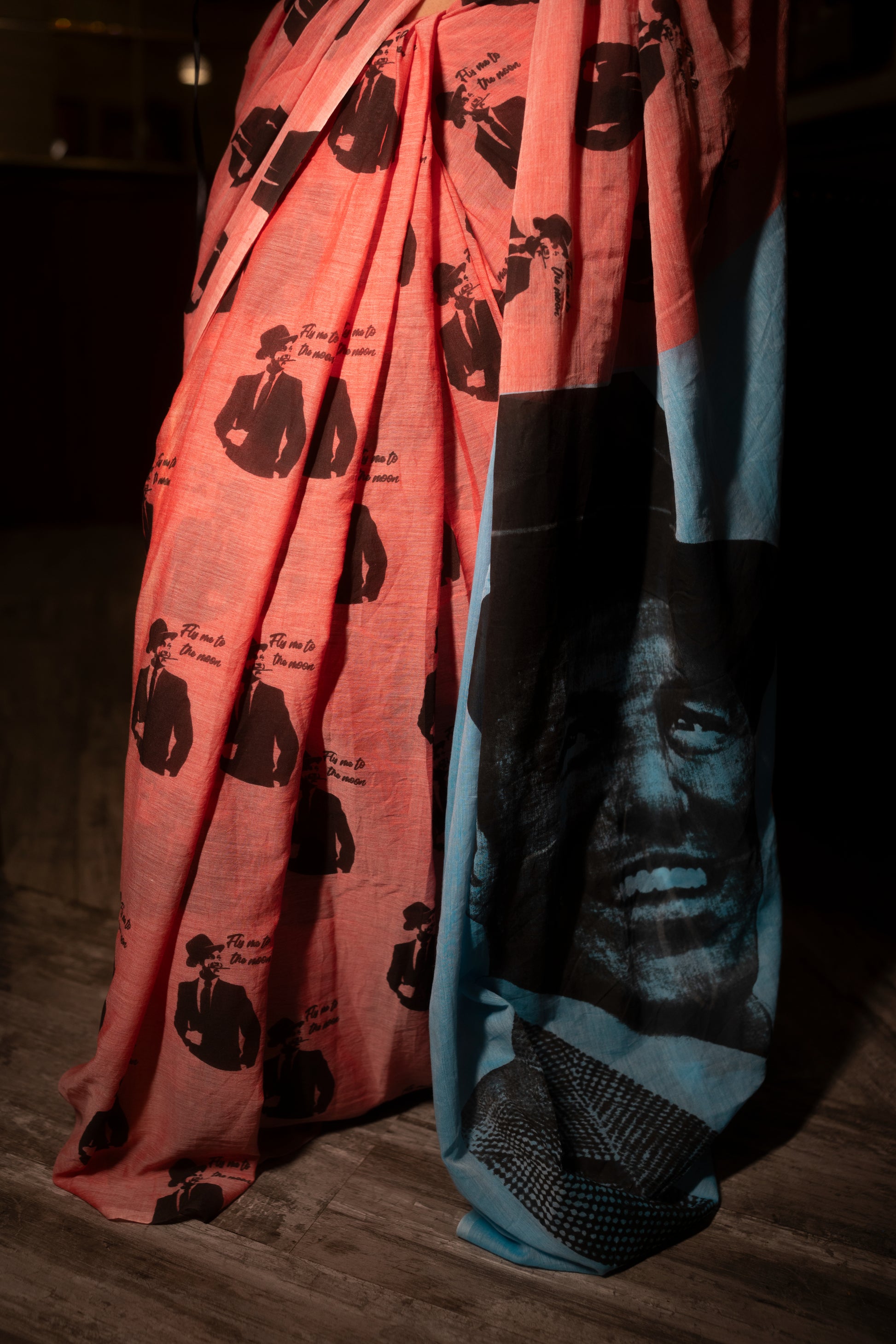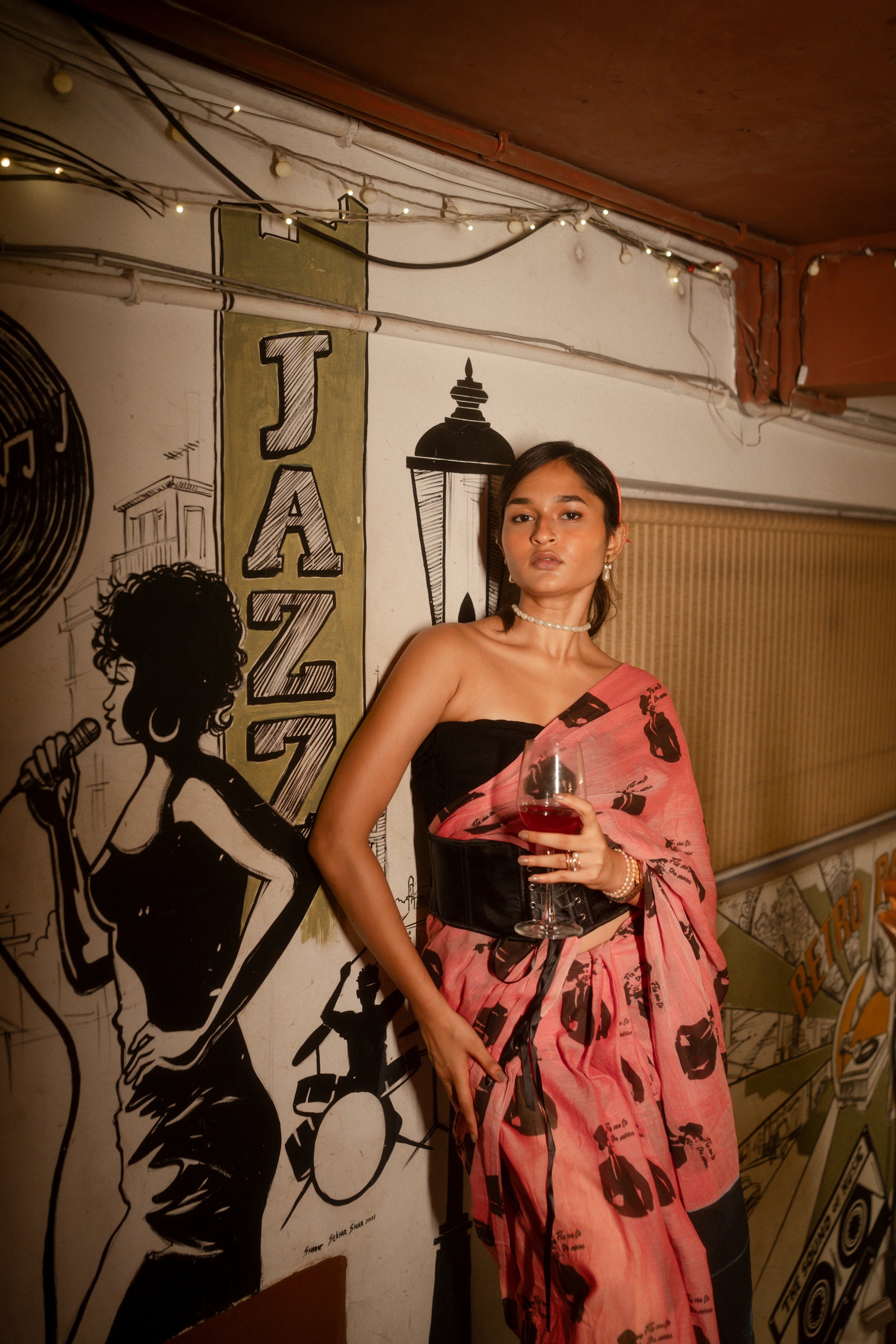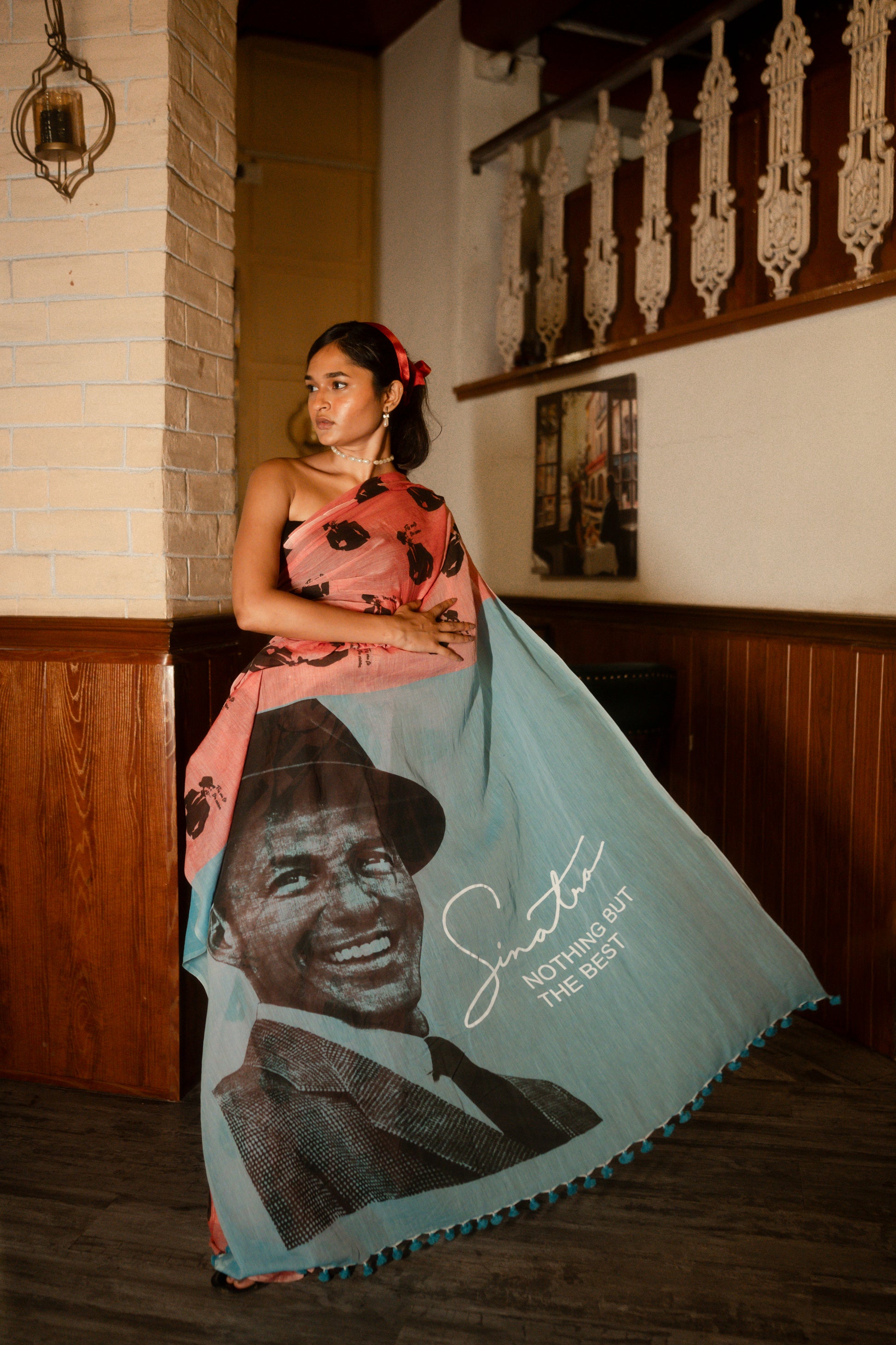 This exquisite pink-blue saree is a celebration of timeless elegance, much like the legendary Frank Sinatra and his jazz. The body showcases intricate motifs of Sinatra serenading with "Fly Me to the Moon," while the pallu is adorned with the iconic album cover of "Nothing but the Best." A piece that effortlessly embodies sophistication, perfect for those special jazz-infused evenings.