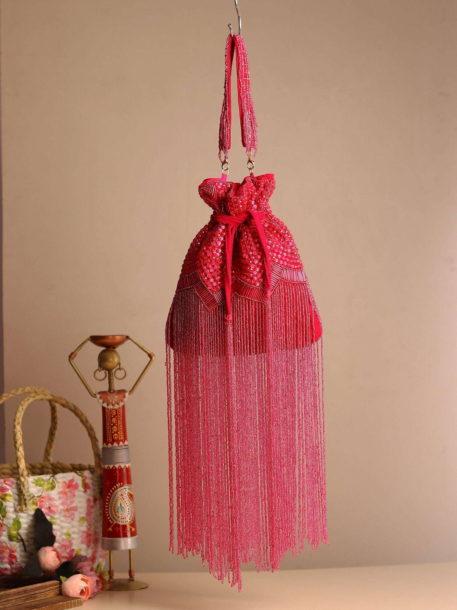 Introducing the Fuchsia Flame Long Tassel Potli Bag, a stunning blend of tradition and modern style. Its vibrant hue is beautifully complemented by an elegant long tassel and a meticulously embroidered handle, showcasing exceptional craftsmanship.
