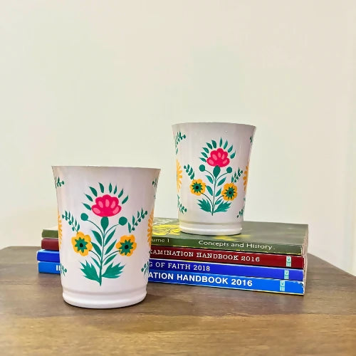 A set of two enameled stainless steel glasses featuring stylized floral motifs, hand-painted by traditional artisans. Perfect to serve sherbets and delicious homemade drinks at festive get-togethers. Also, makes for a great gift for loved ones.
