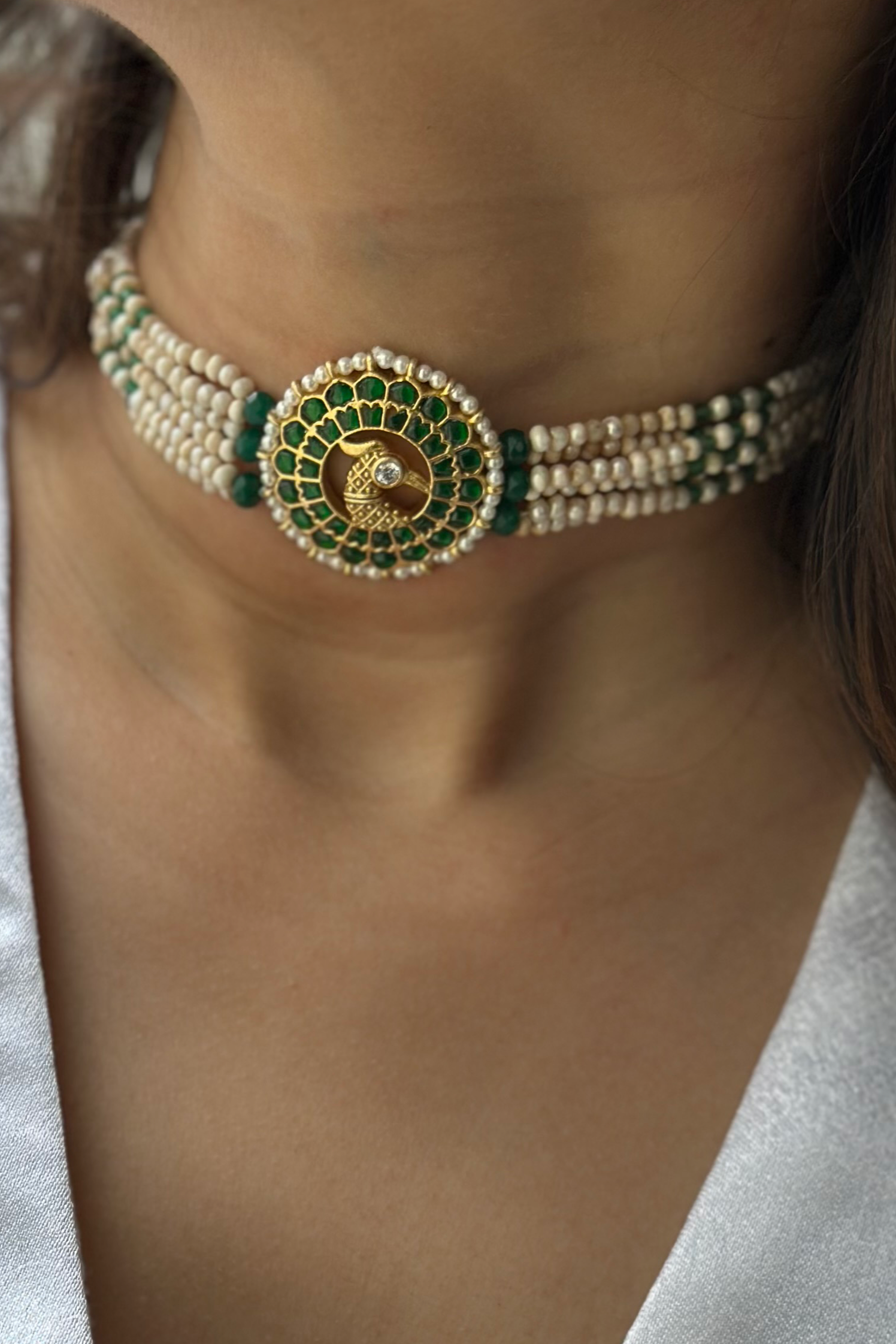 The Garuda Choker is a luxurious fusion of tradition and artistry. Crafted from hallmarked 92.5 fine silver and plated with rich gold, this 6.5-inch choker features a central motif adorned with Kundan emeralds and natural antique pearls.