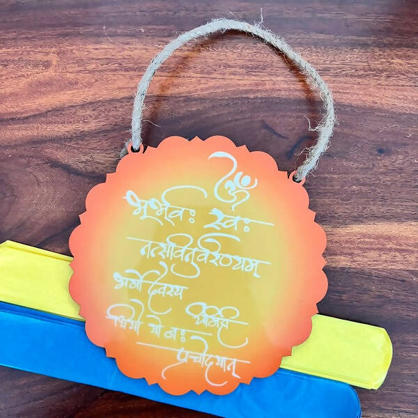 Our Gayatri mantra wall decor is designed to add a yogic touch to the walls of your home. It features Indic colours, with devnagiri lettering printed clearly on top of an acrylic-lined wooden base cut in an ornamental circular shape. Hang in the altar or the puja room to facilitate gratitude, inner transformation, and peace. If you're looking to incorporate a powerful Vedic charm (with a twist of modern design), it functions as a trendy adornment for the bedroom too. Let it be the first thing you look at in the morning, and kick-start the day with a calm mind.