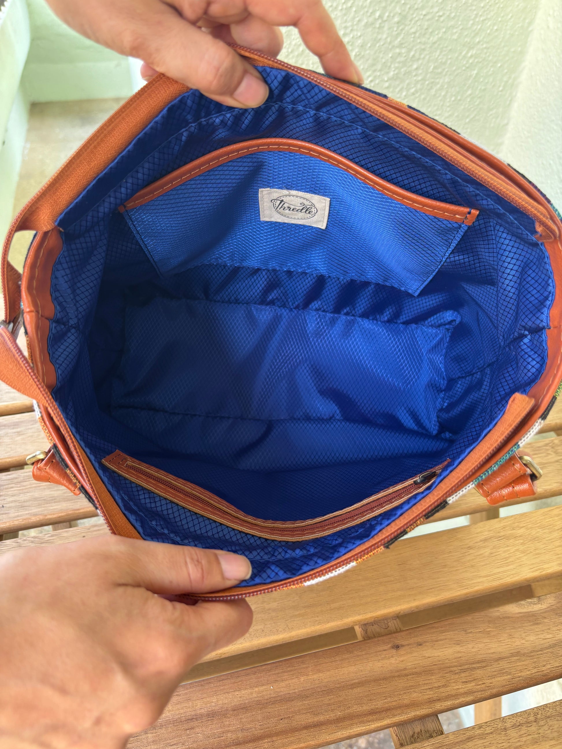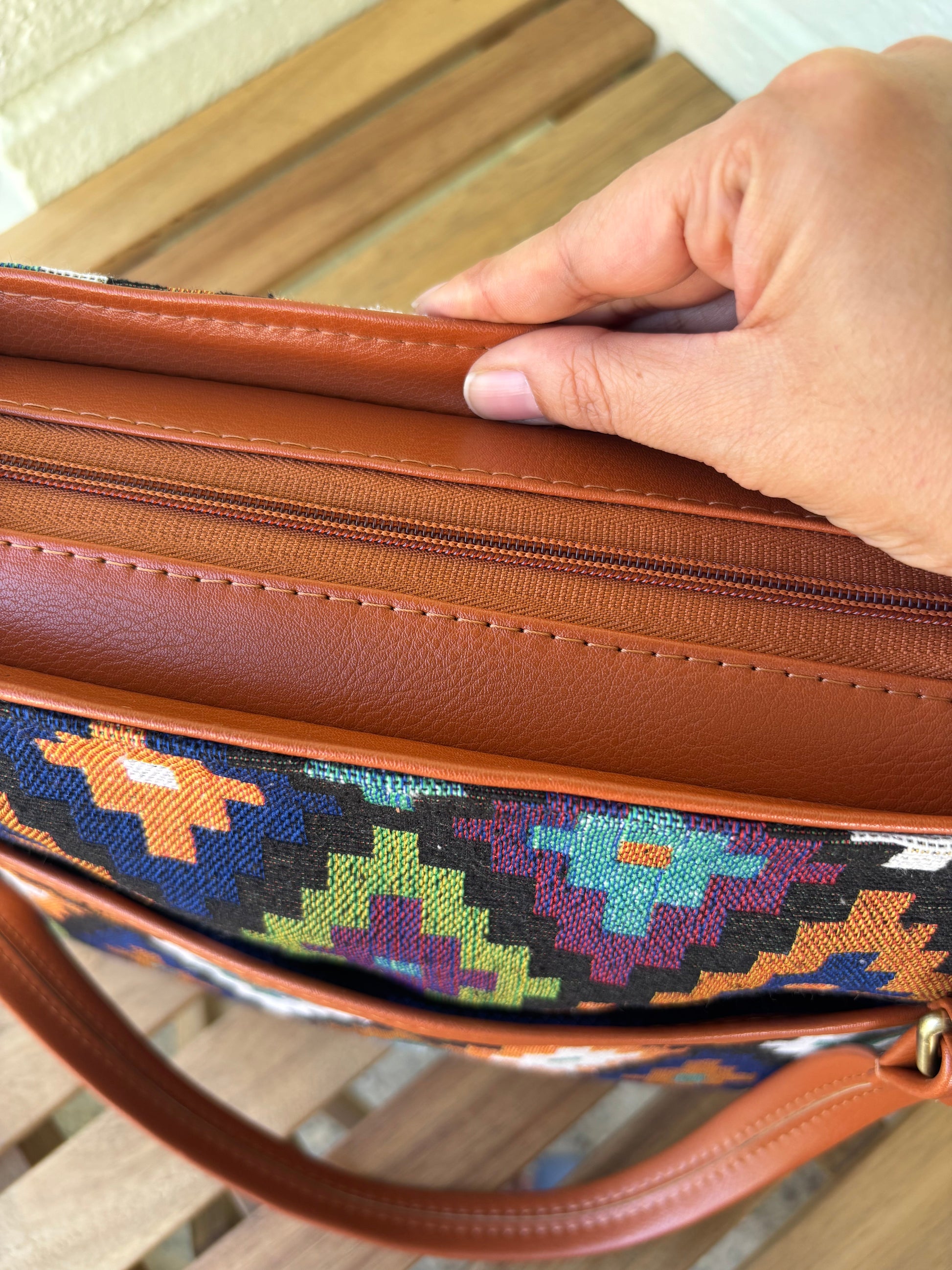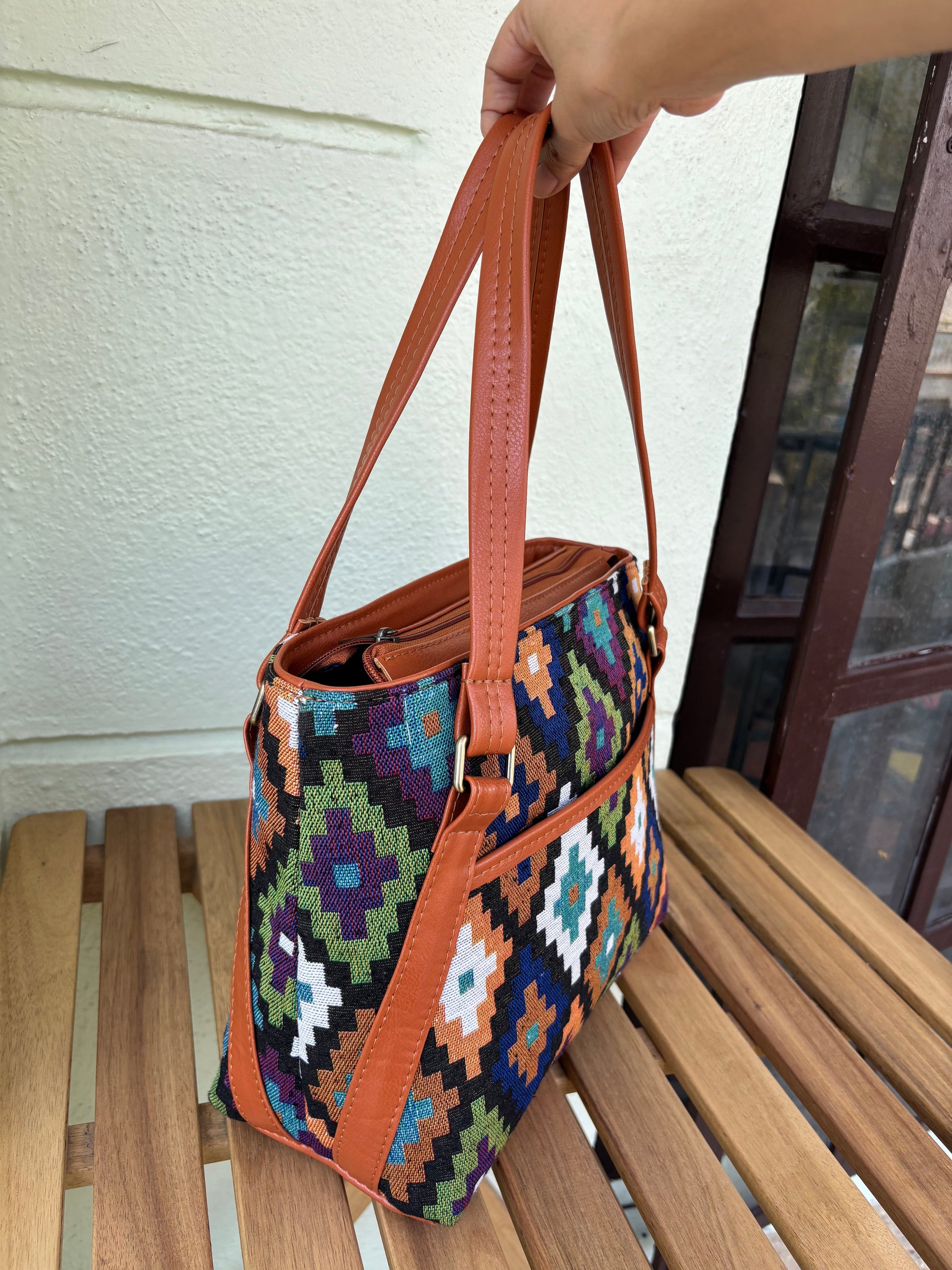 Bold and versatile, the Geo Weave Tote pairs rich geometric woven fabric with premium faux leather for a striking, textured look. Designed for everyday ease, it features a spacious interior with organized pockets and a quick-access outer pocket — perfect for work, travel, or casual outings with a modern twist.