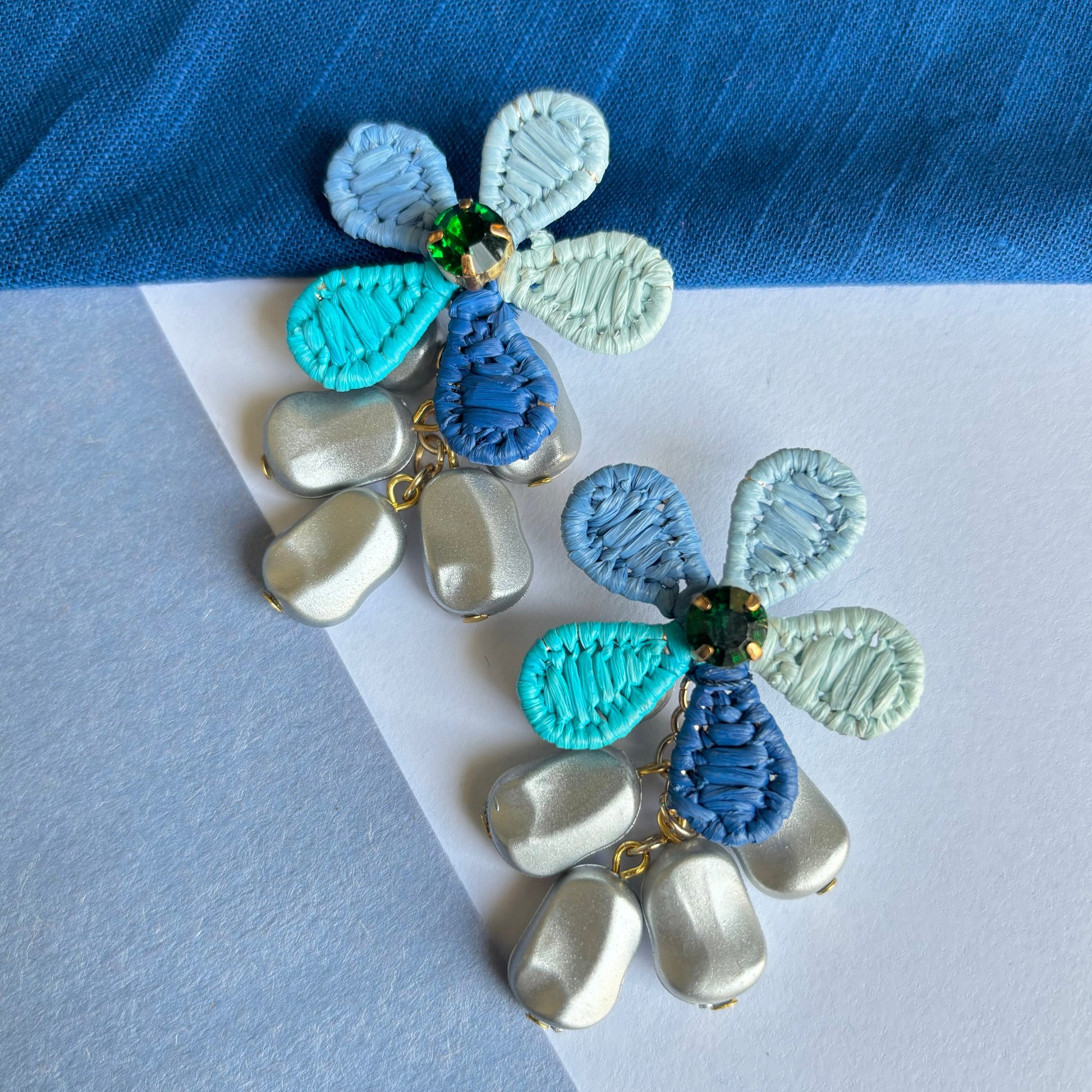 These flower earrings are a stunning accessory with delicate petals and vibrant shades of blue. Dangling from the petals are silver raw crystal-shaped motifs.