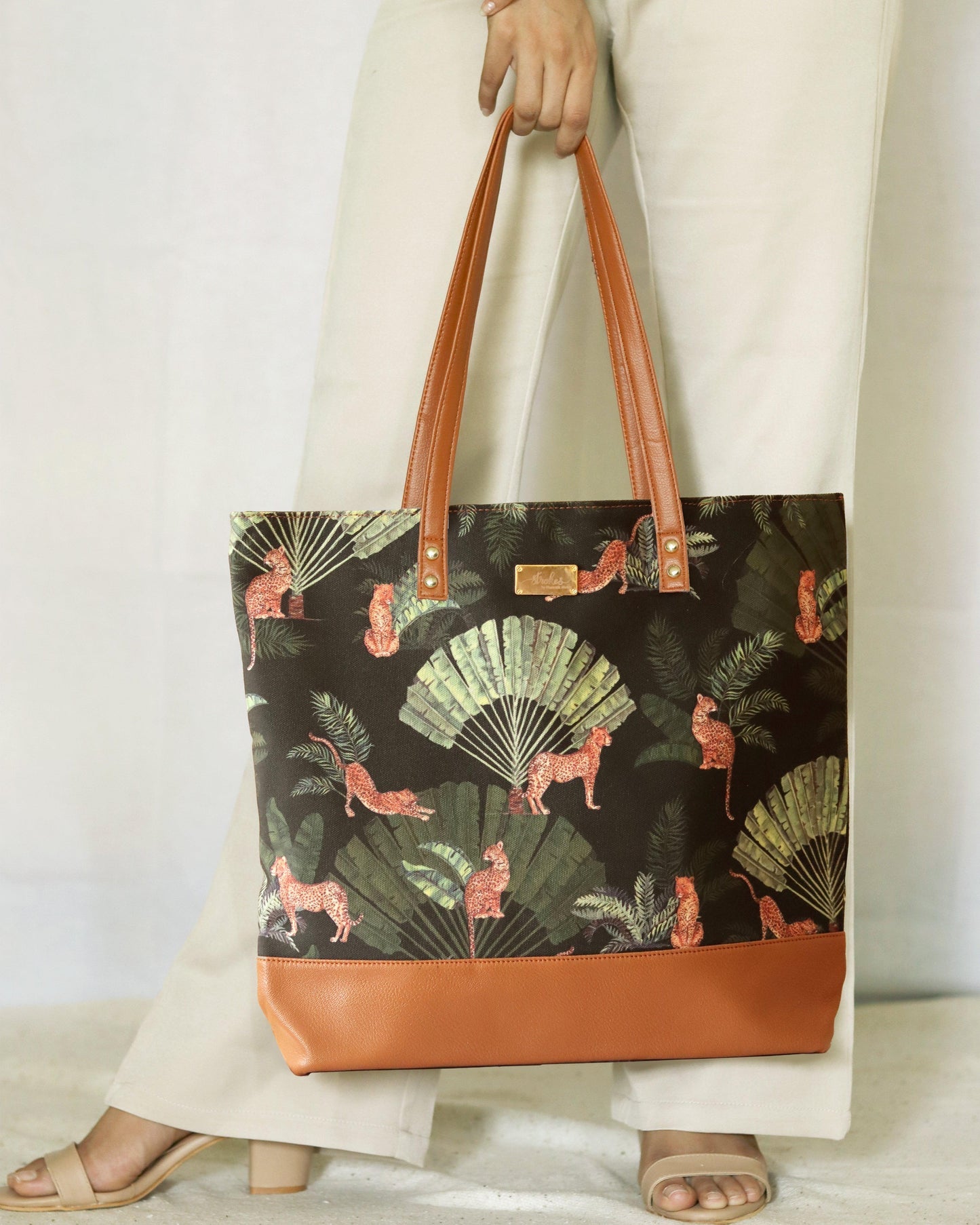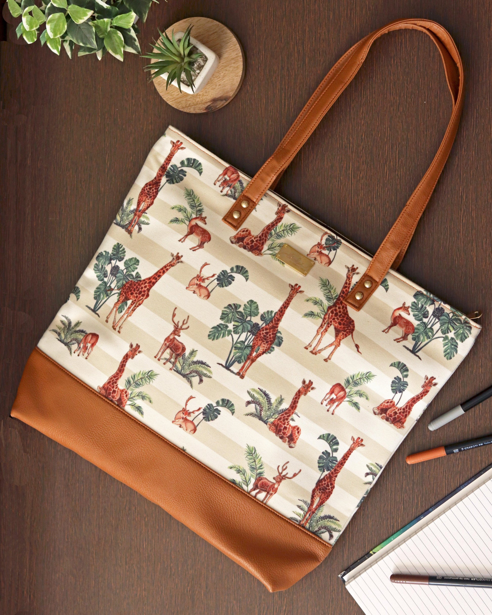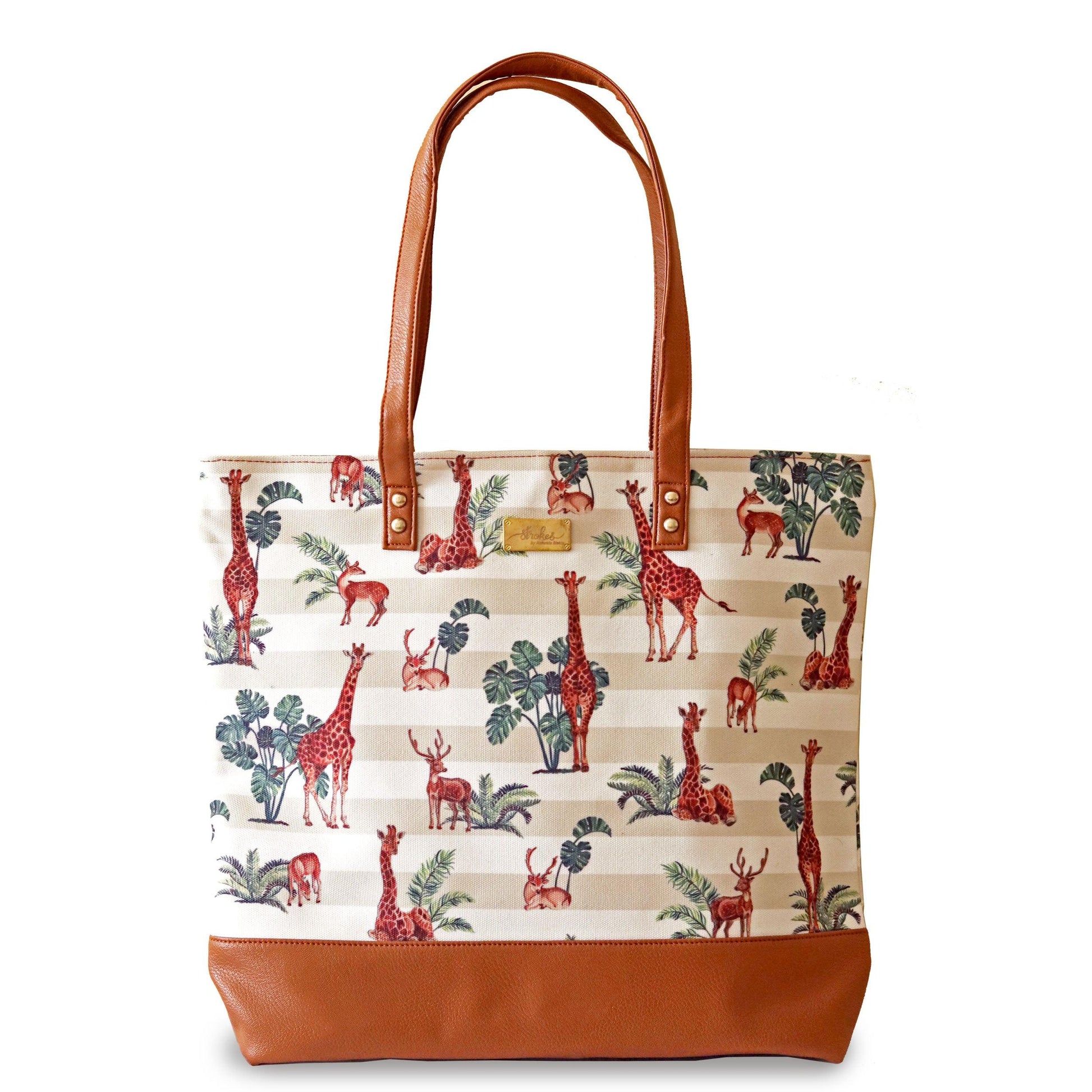 A quirky and eye-catching wildlife illustration on beige cotton canvas. This beautiful tote bag is meant for easy-going people.It is durable with vegan leather handles and base, and spacious, with 3 inner pockets for spare cash and valuables.