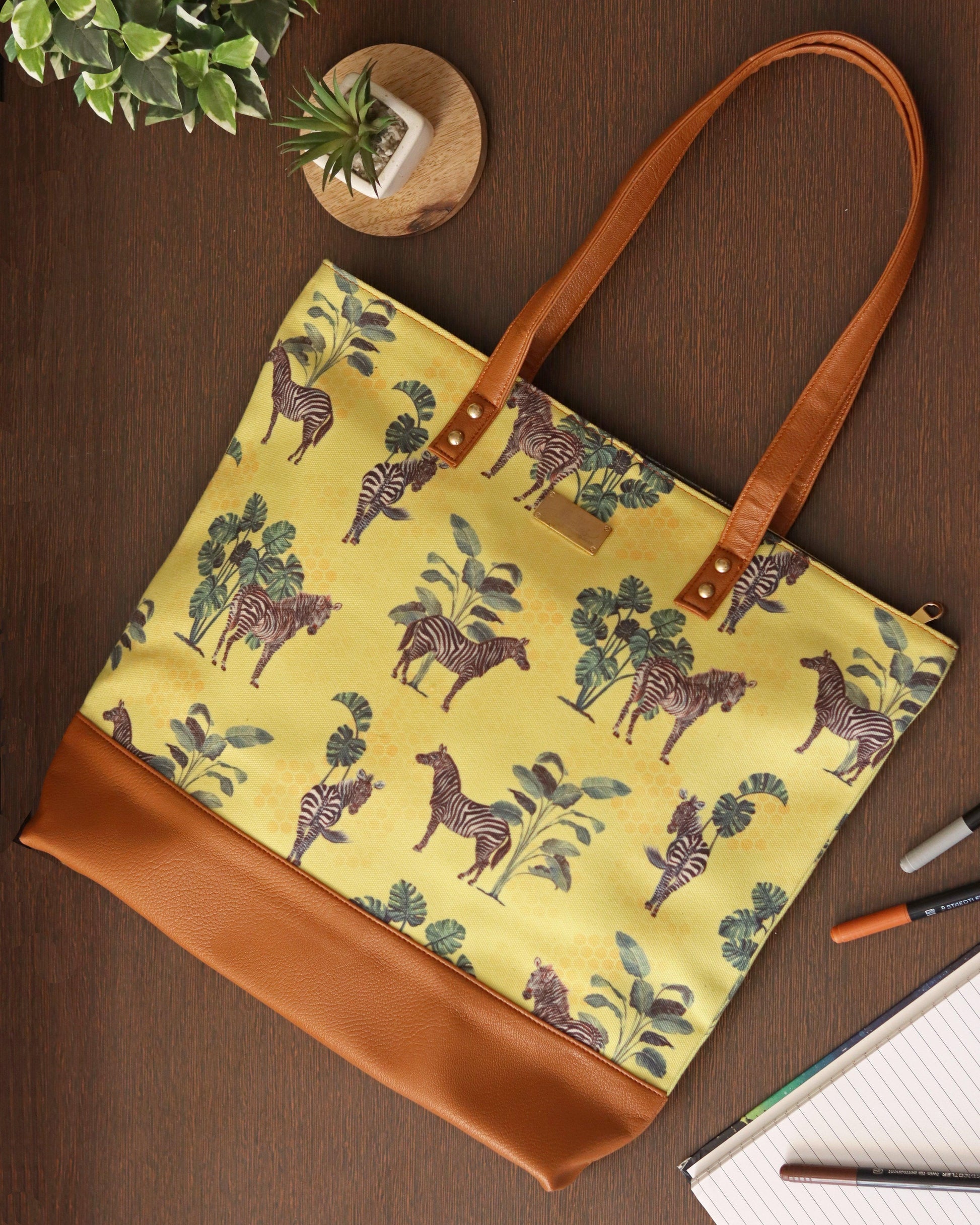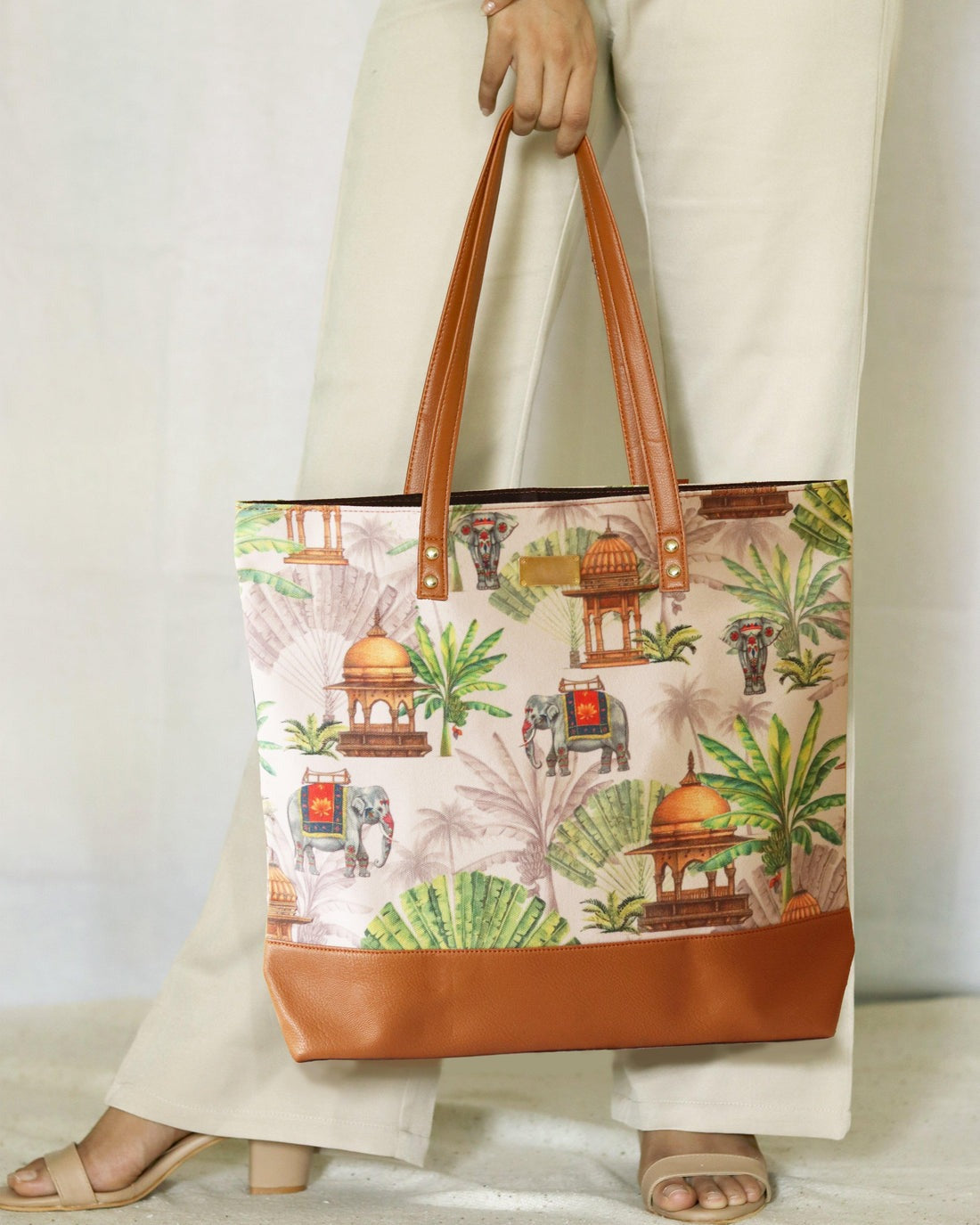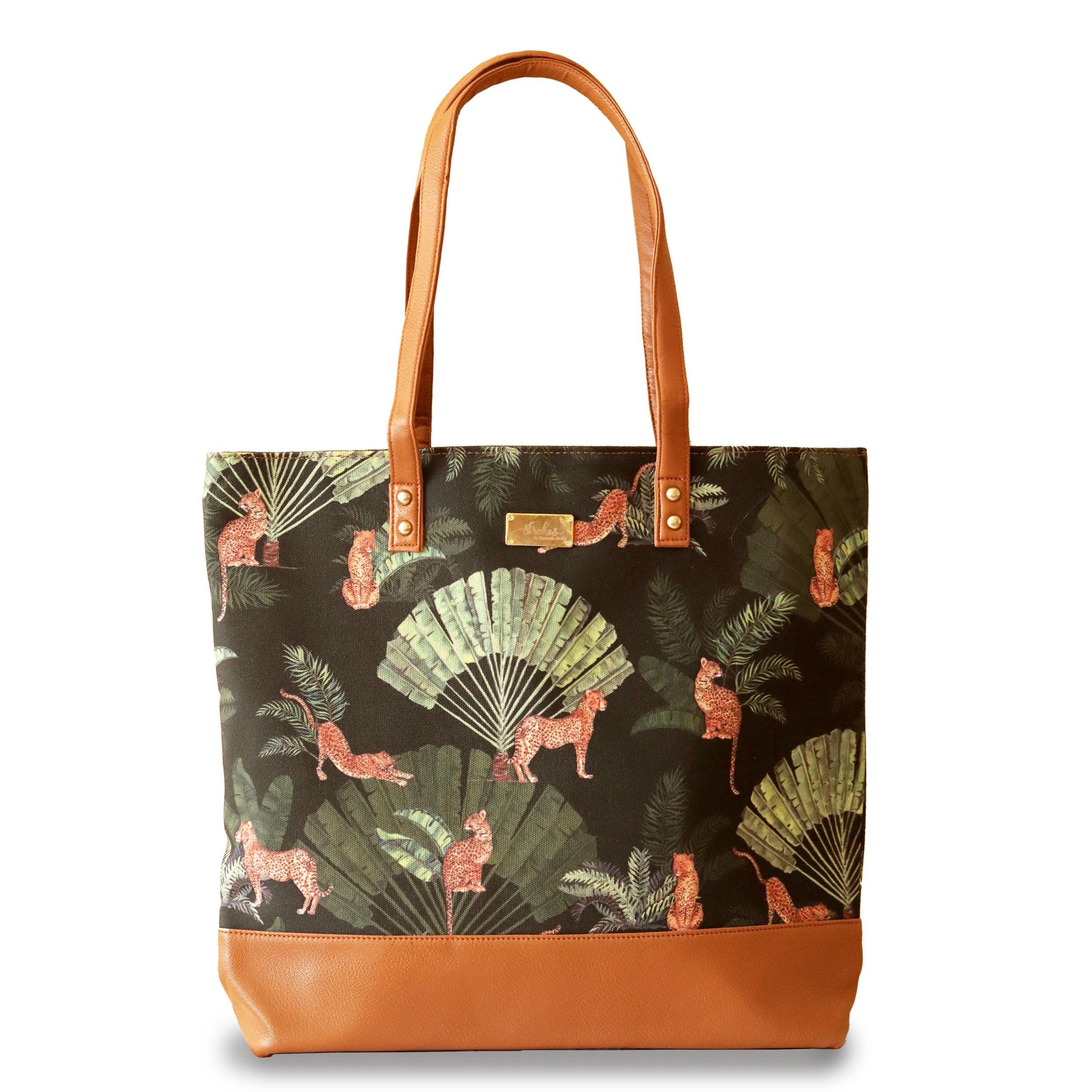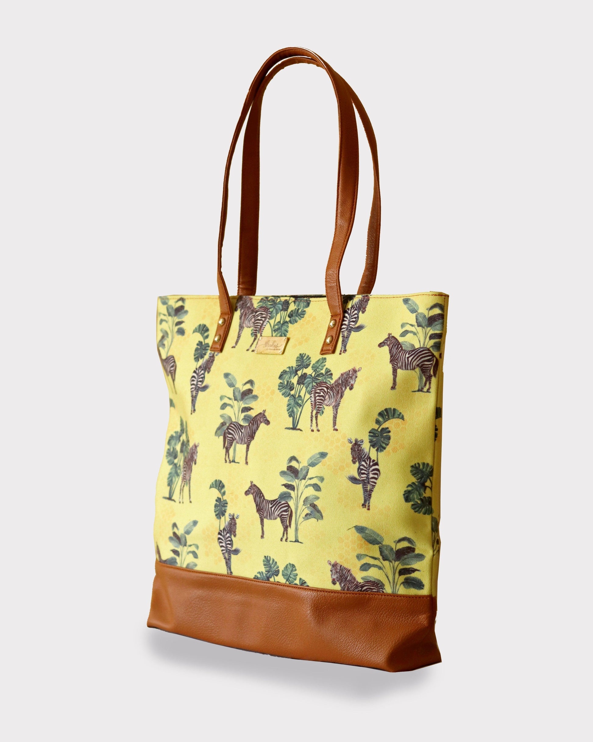 A quirky and eye-catching wildlife illustration on beige cotton canvas. This beautiful tote bag is meant for easy-going people.It is durable with vegan leather handles and base, and spacious, with 3 inner pockets for spare cash and valuables.