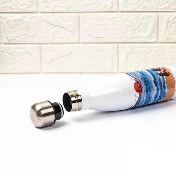 The Sunset Shores Steel bottle showcases a girl with her dog, experiencing a beautiful sunset at the sea exuding serene tranquility! This bottle is crafted with high quality 304 grade double walled stainless steel interior to keep hot drinks hot or cold drinks cold for hours. No wonder this is the most preferred choice when it comes to beautiful yet thoughtful gifting, especially when it comes to dog lovers!