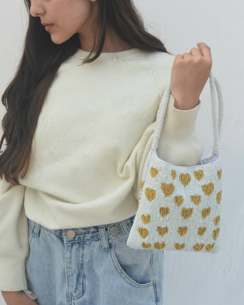 This bag is embroidered with white beads base and golden seed beads with heart shaped detailing. The bag has ample of space to keep all of your essentials. It has one main compartment and a small inner pocket with a button closure. Bags are handcrafted by local artisans using various age old embroidery techniques.