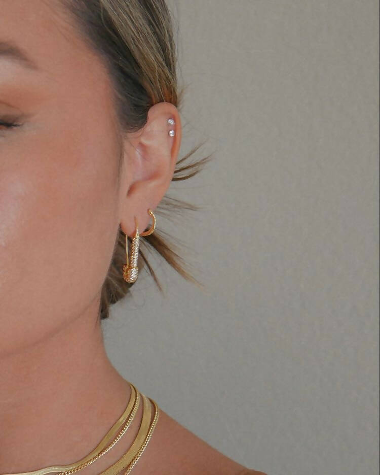 Crafted with shimmering pavé stones, our Safety Pin Earrings add a unique and trendy vibe to any ensemble. They are hypoallergenic, anti-tarnish and water-resistant.