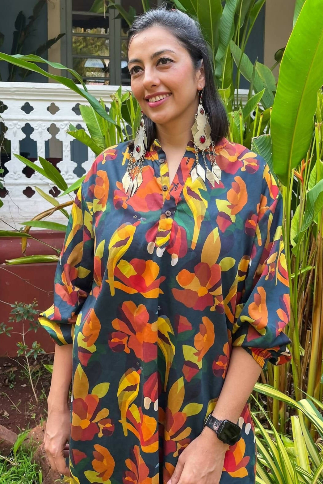 A delicious Goa-inspired print (in organic cotton) complete with cashew apples and the flame-throated Bulbul rendered in a fuss-free shirt dress format! What’s not to like? Made especially for lazy days, this easy-breezy outfit will go from day to night in 100% Organic cotton with Elastic cuffs, curved Hem, Mandarin collar, Curved hem, Dropped shoulder with coconut shell buttons.