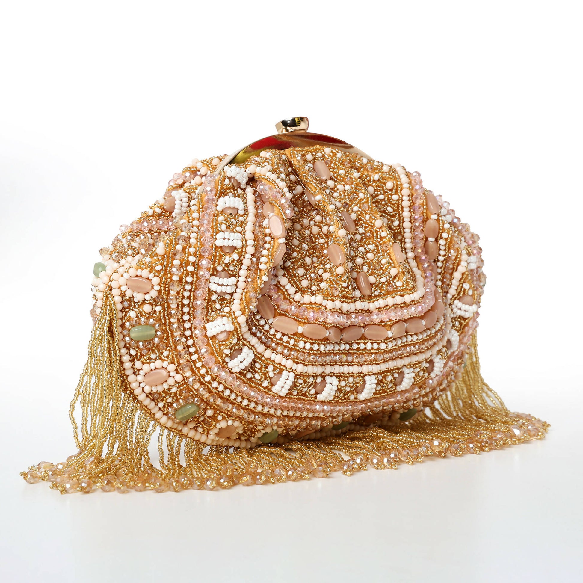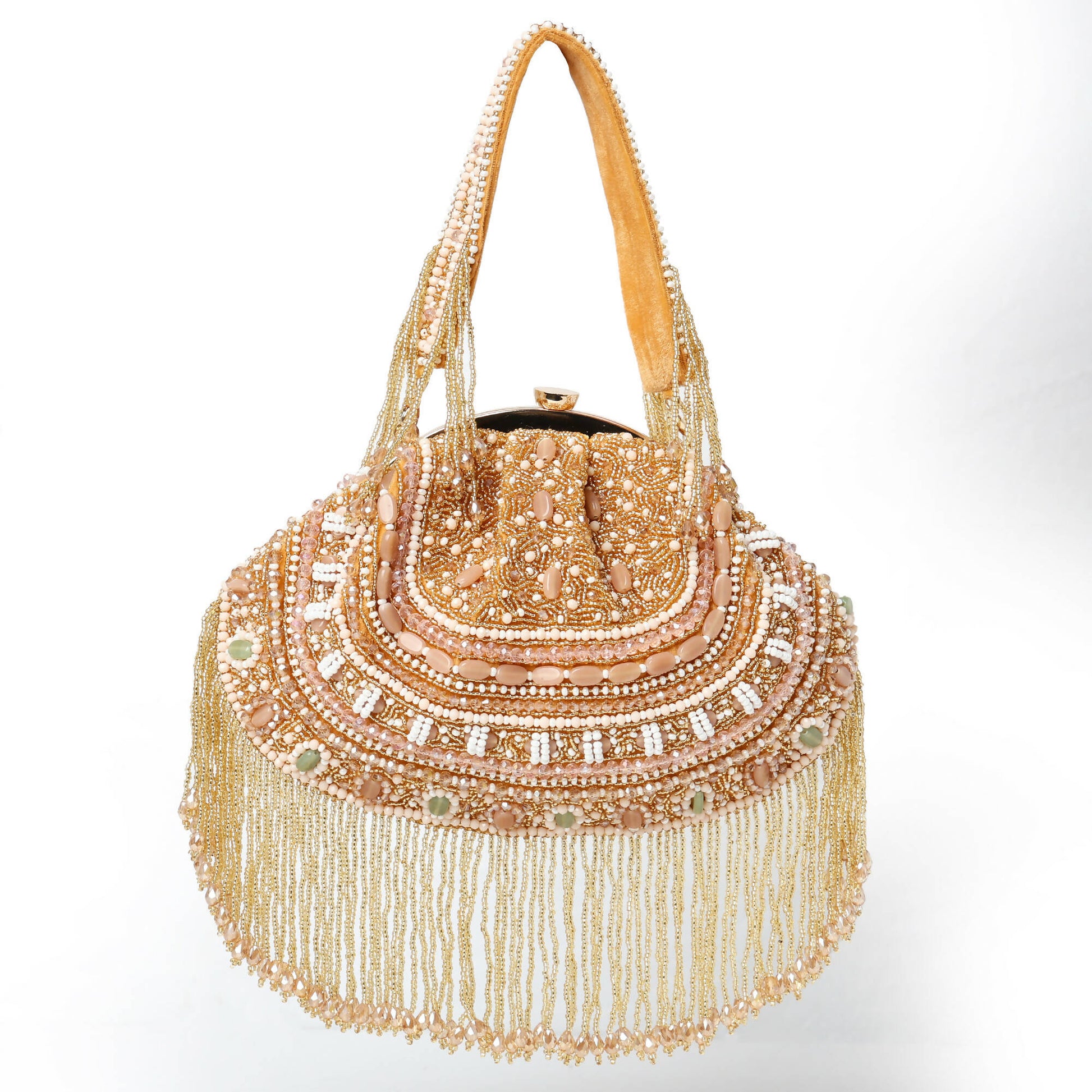 Golden Beaded Batua Bag, featuring a delicately embroidered short handle and charming tassels for added flair.