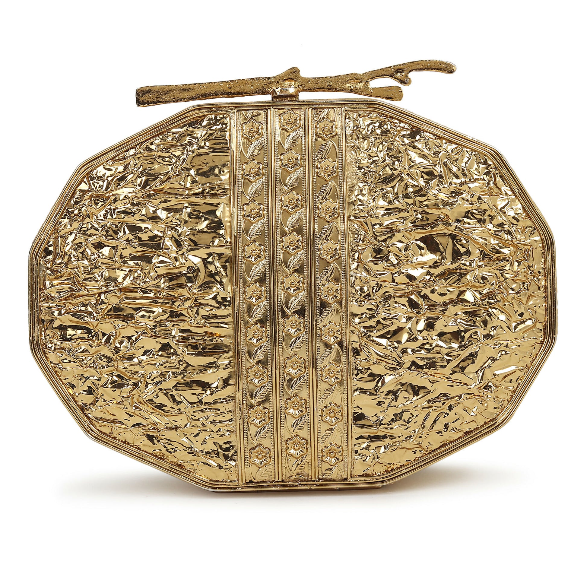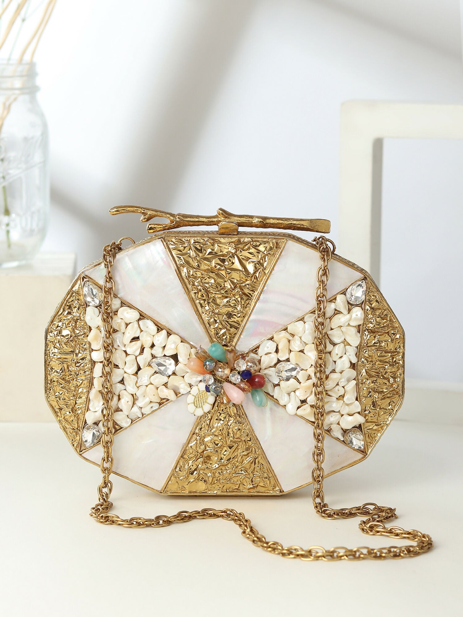 Introducing the Golden Gleam Oval MOP Clutch, a luxurious accessory that radiates elegance. Adorned with exquisite pearl shell embellishments, this clutch captures light beautifully, creating a stunning focal point for any outfit.
