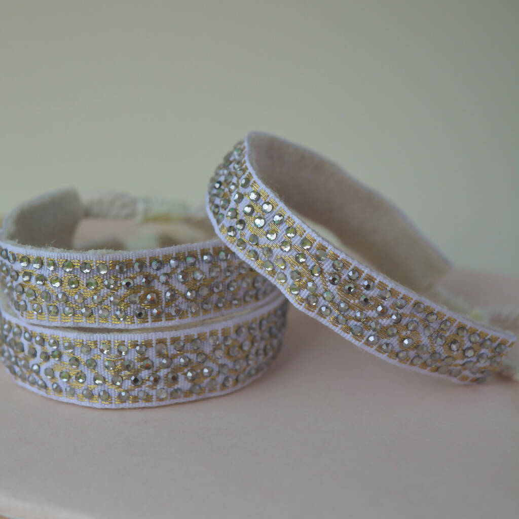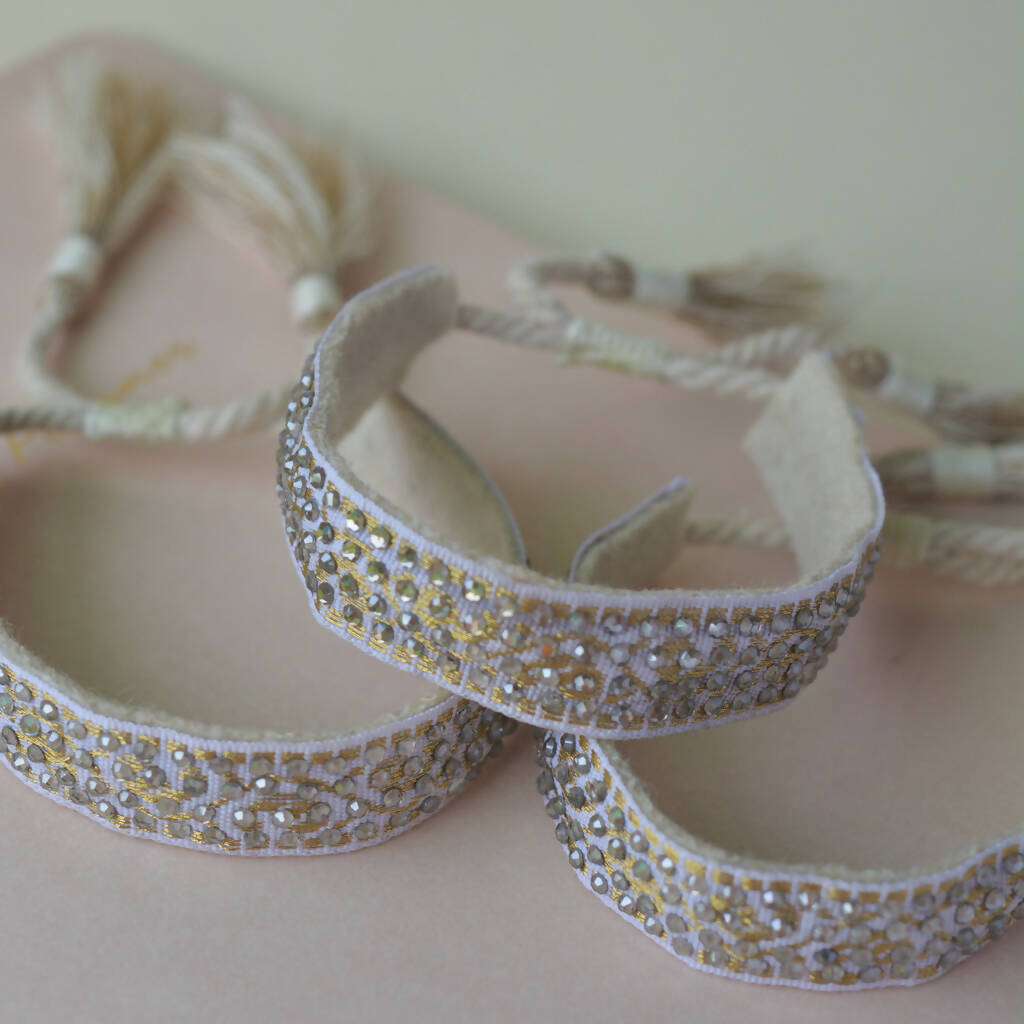This one size fits all handwoven band is embellished with rhinestones all over it. The base of the band has a shiny golden hue complimenting the crystal stones. The band has matching golden tassel ends and comes with an adjuster to fit any wrist size perfectly. This band is a statement piece that can be worn alone or stacked with other hand accessories.