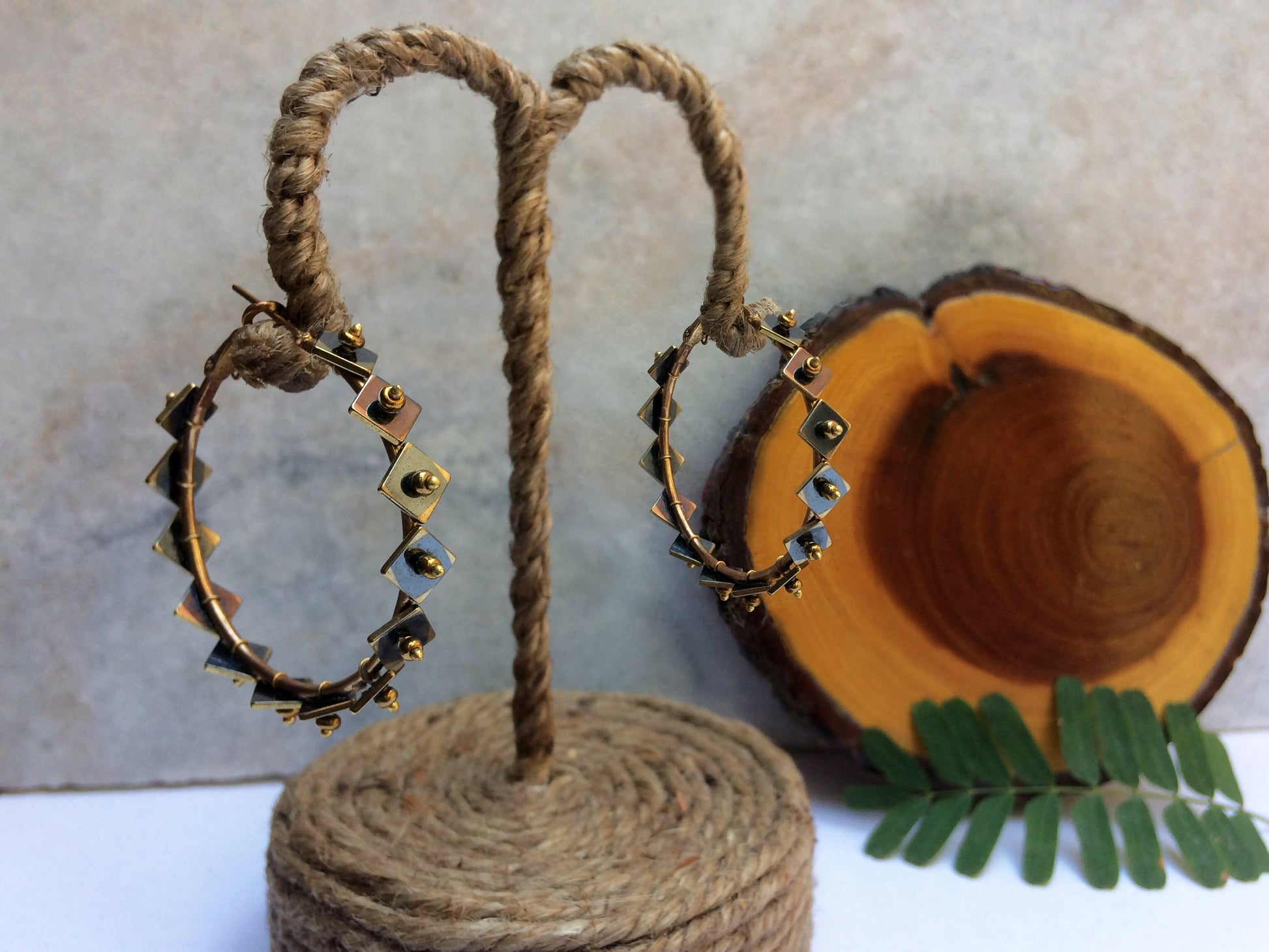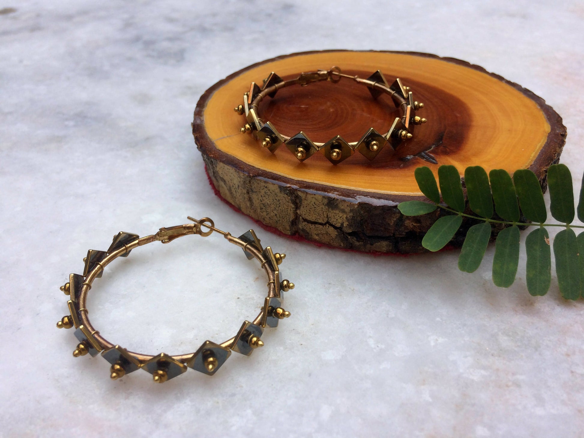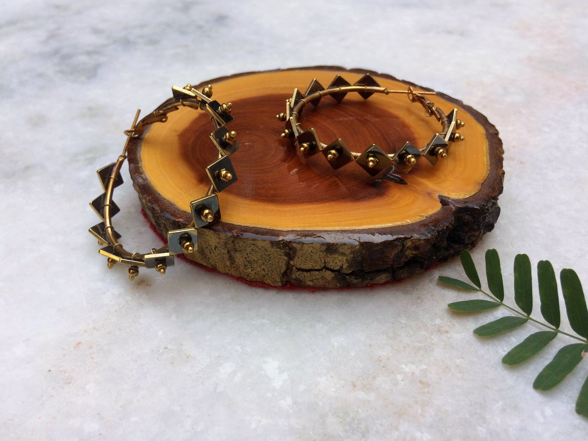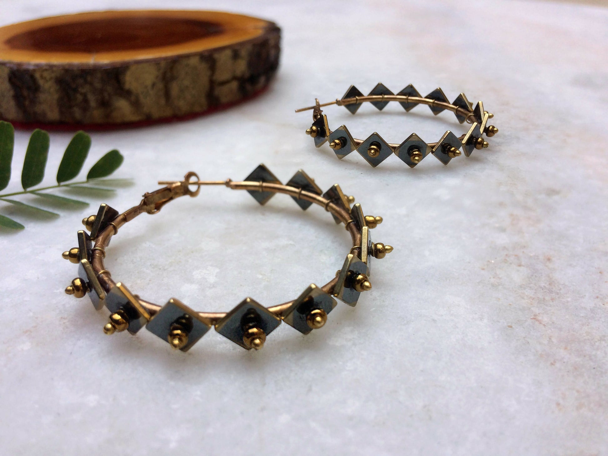 It's easy to achieve a modern, minimalist look with our Golden Kite and Beads Hoop Earrings! These shiny golden statement earrings have metal squares and beads arranged in a geometric design.