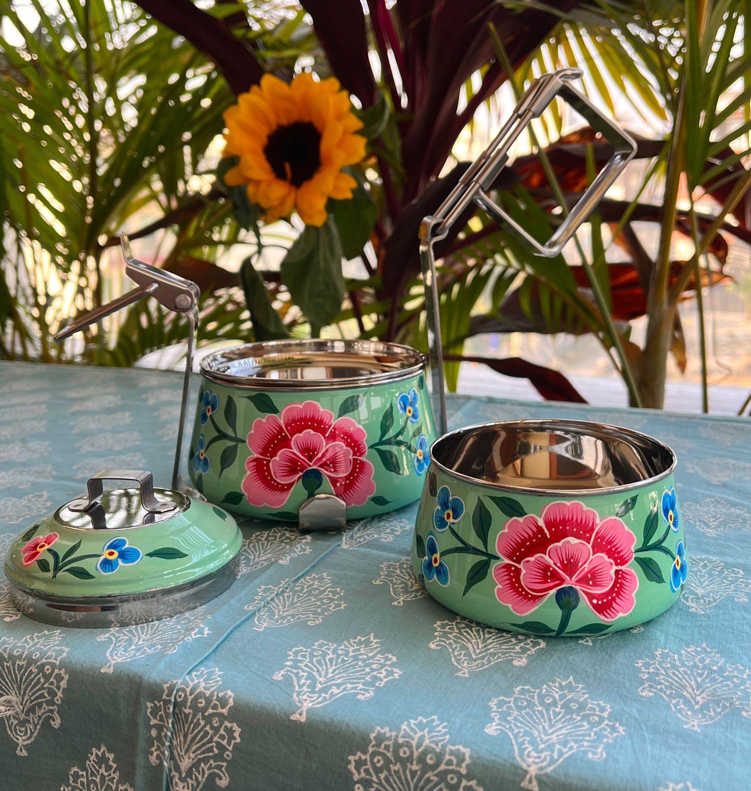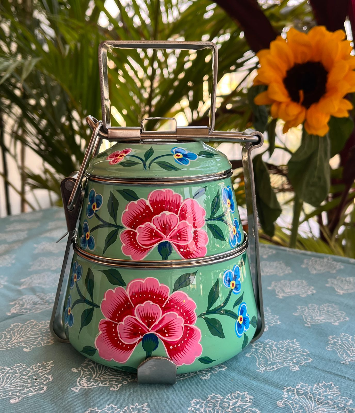 Green hand painted 2 Tier Stainless Steel Tiffin