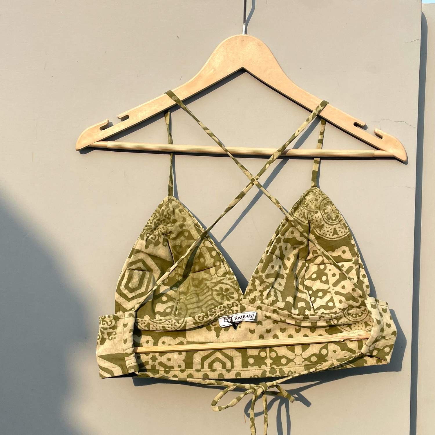 The Green Patch Hand Block Bralette is a stunning fusion of traditional craftsmanship and contemporary design. Made from soft, breathable fabric, it features intricate hand-block prints in earthy green tones, showcasing a patchwork of patterns that reflect timeless artistry.