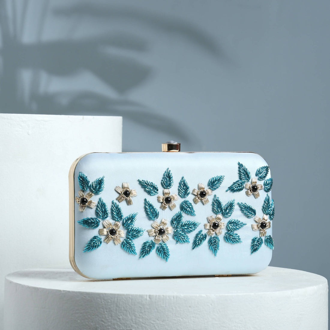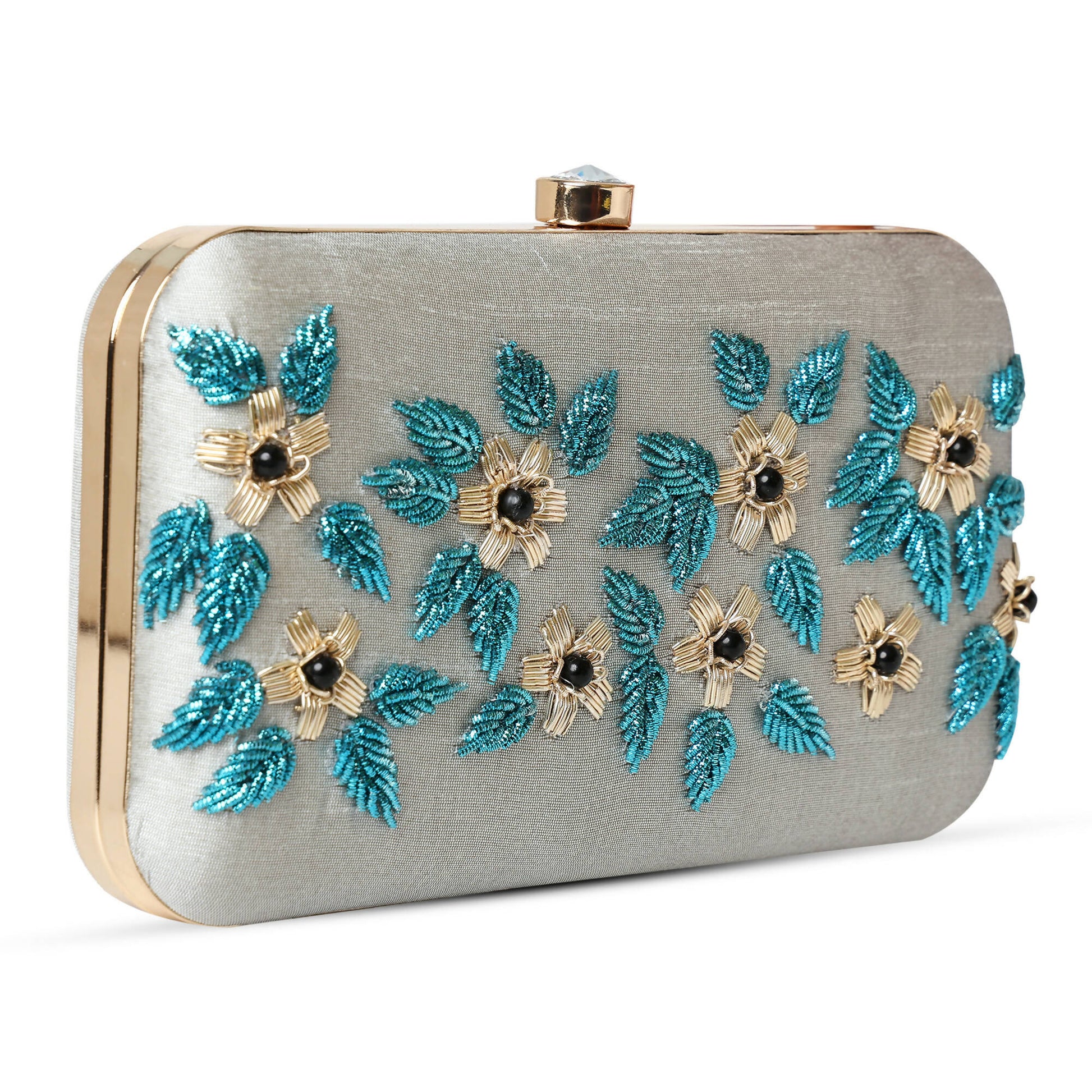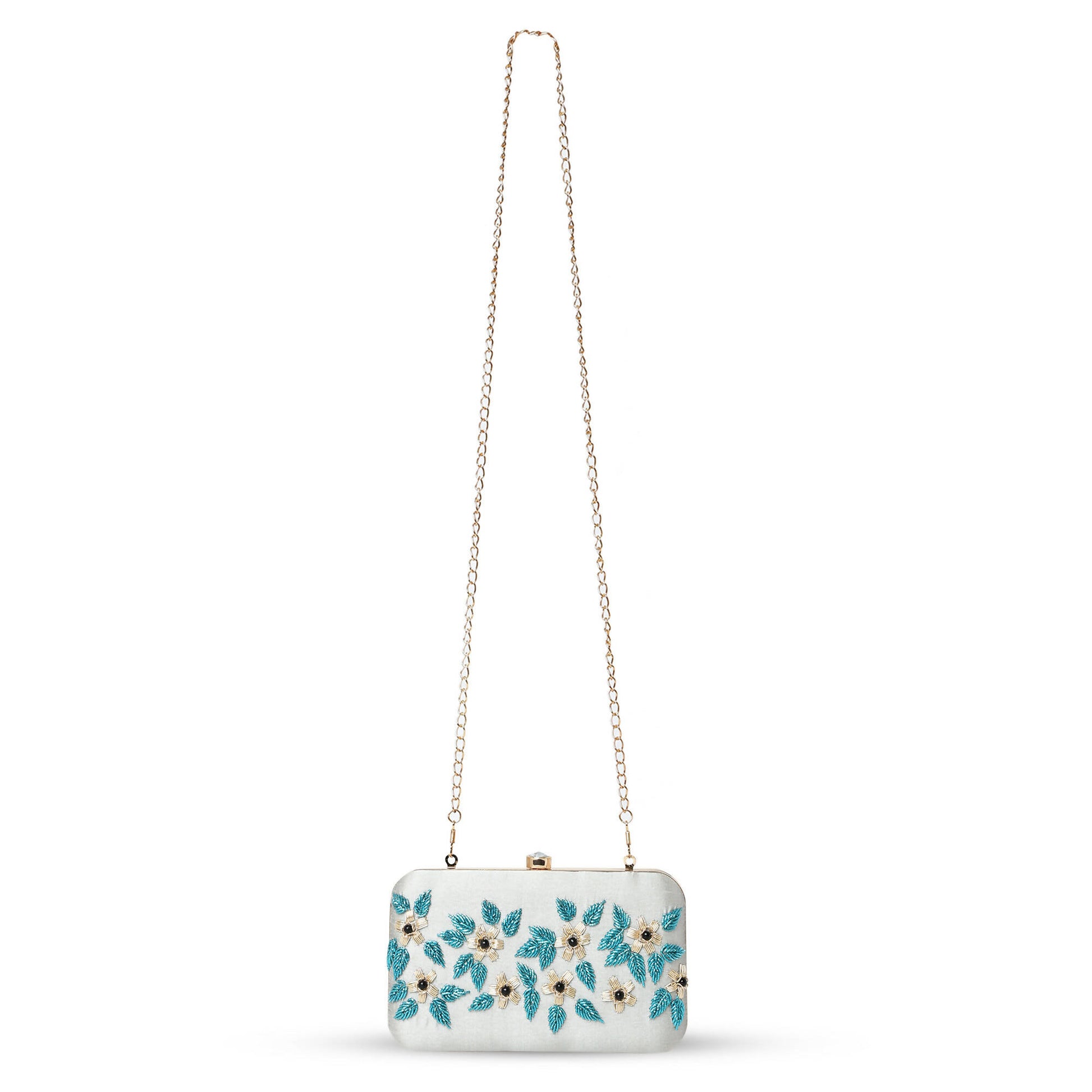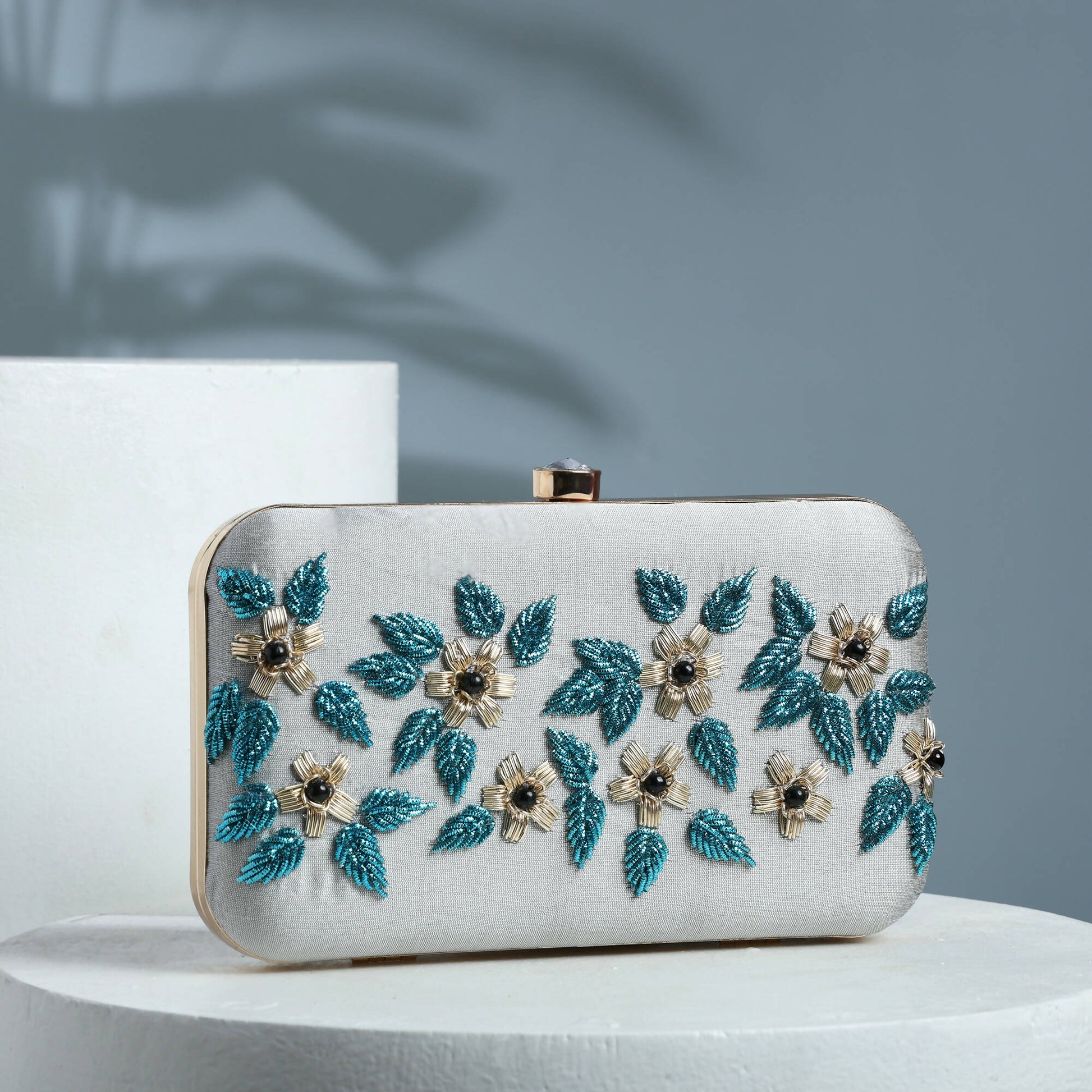 Chic and versatile, our grey silk clutch boasts intricate blue embroidery and subtle pearl accents. With a detachable sling chain, it's the perfect companion for any event.