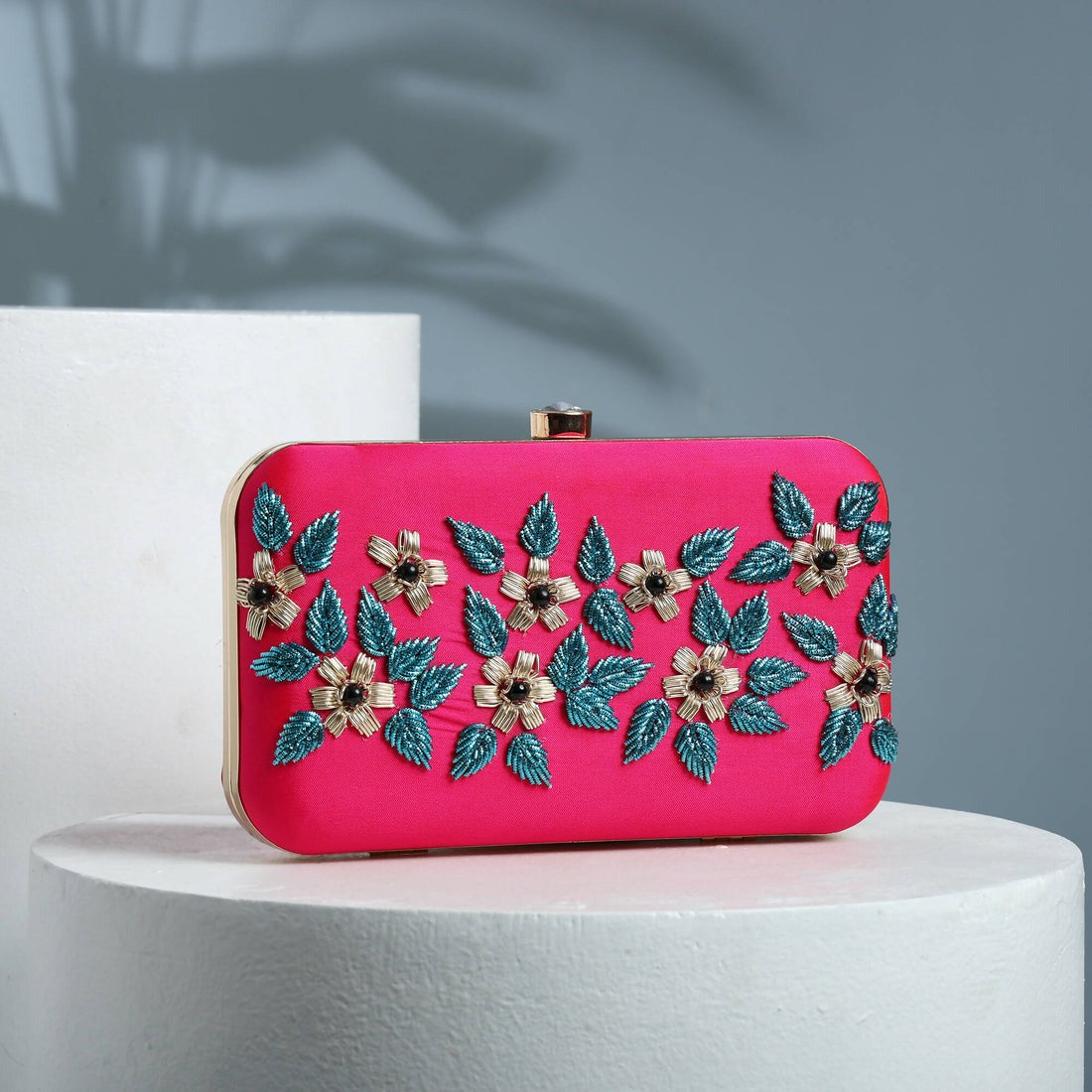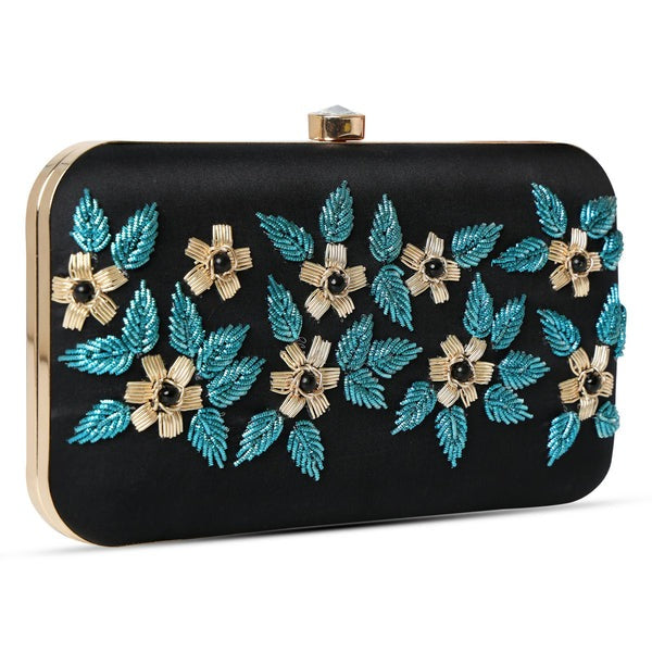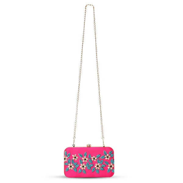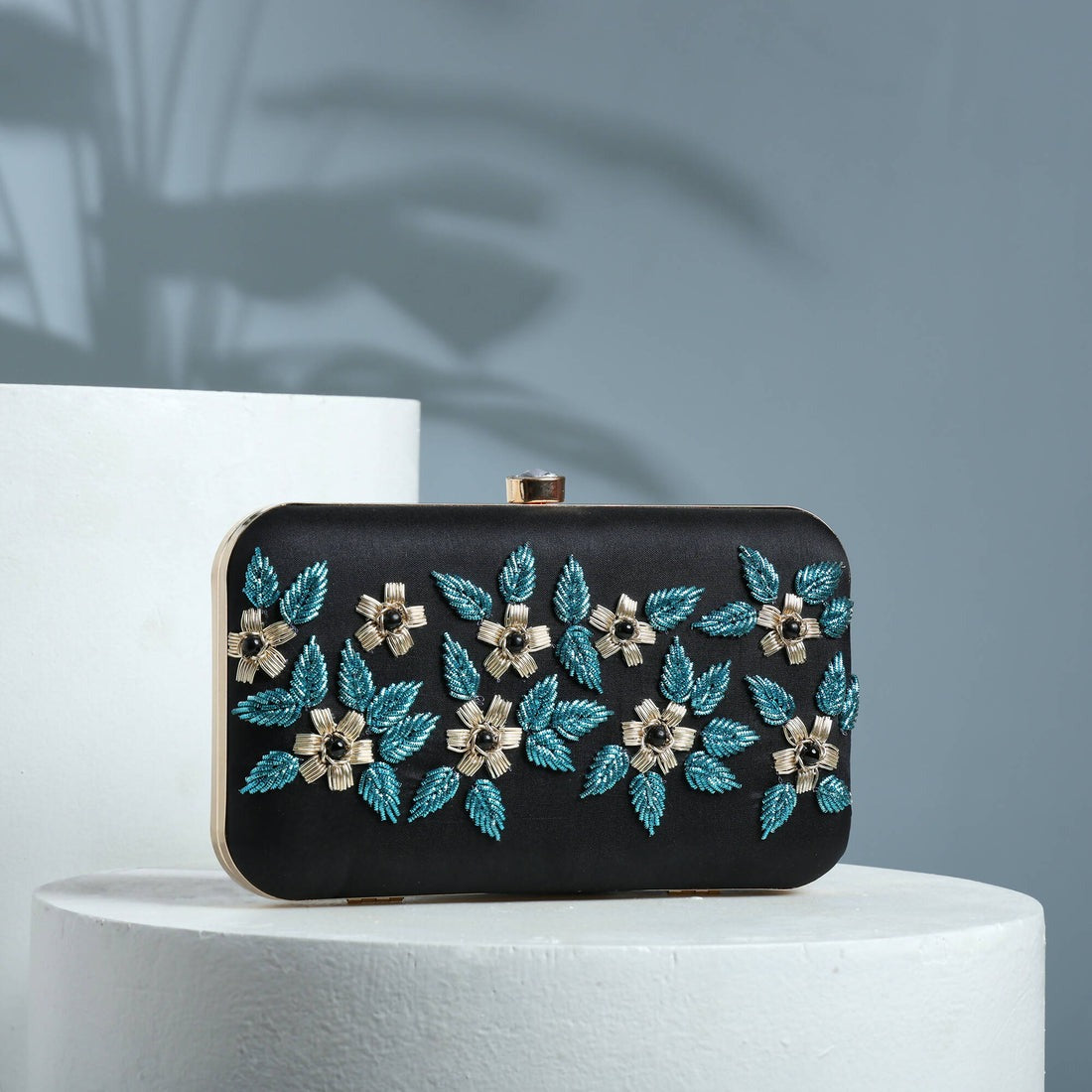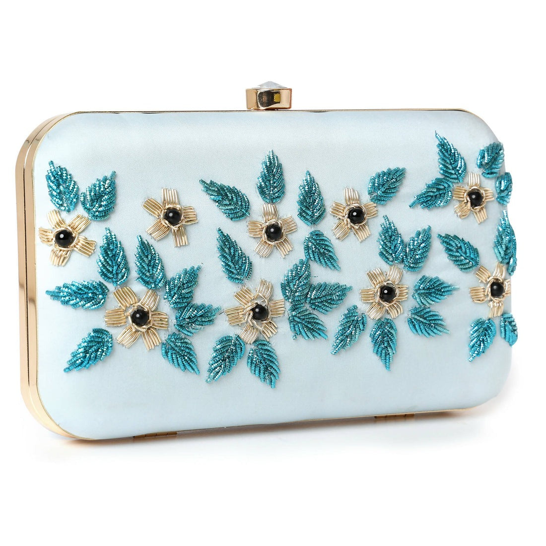 Chic and versatile, our grey silk clutch boasts intricate blue embroidery and subtle pearl accents. With a detachable sling chain, it's the perfect companion for any event.